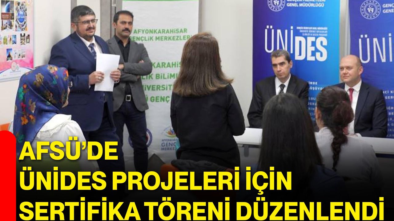 Afyonkarahisar Sağlık Bilimleri Üniversitesi (AFSÜ) öğrenci kulüp ve topluluklarının Gençlik ve Spor Bakanlığının Üniversite Öğrenci Toplulukları İş Birliği ve Destek Programı (ÜNİDES) kapsamında yürüttüğü ve başarıyla tamamladığı on proje için sertifika töreni gerçekleştirildi. AFSÜ Genç Ofis’te düzenlenen törene Afyonkarahisar Vali Yardımcısı Bedir Deveci, AFSÜ Rektör Yardımcıları Prof. Dr. İbrahim Keleş ve Prof. Dr. Ahmet Ali Tuncer, SKS Daire Başkanı Filiz Özden Yılmaz, öğrenciler ve danışman akademisyenler katıldı.