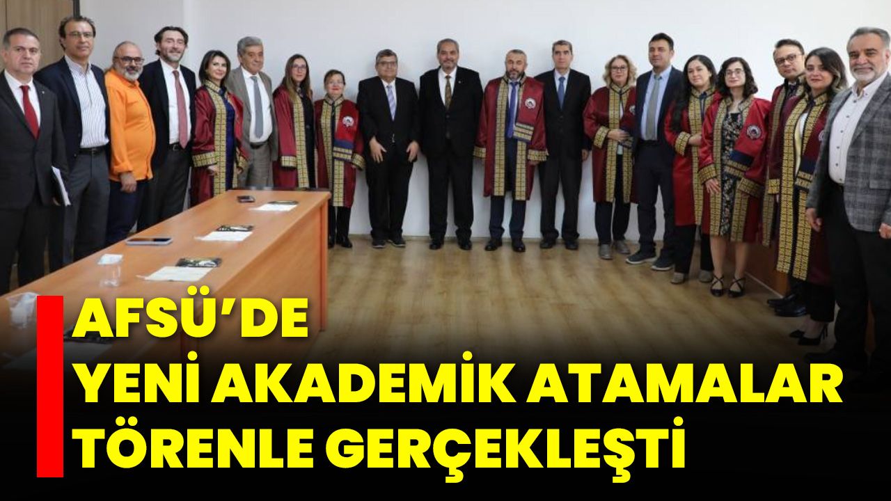 Afyonkarahisar Sağlık Bilimleri Üniversitesi’nde (AFSÜ) Yönetim Kurulu kararıyla kadro ataması yapılan dokuz öğretim üyesi için anlamlı bir tören düzenlendi. AFSÜ Yönetim Kurulu Toplantısı sonrasında gerçekleştirilen törende, öğretim üyelerine cübbeleri Rektör Prof. Dr. Adem Aslan, Rektör Yardımcıları Prof. Dr. Ümit Dündar, Prof. Dr. İbrahim Keleş, Prof. Dr. Ahmet Ali Tuncer ve fakülte dekanları tarafından giydirildi.