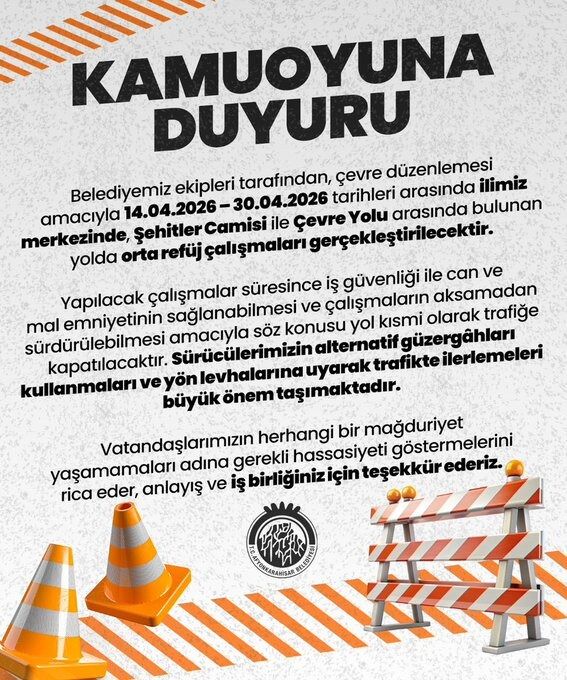 Belediyeden yapılan açıklamada, çalışma süresince hem iş güvenliği hem de can ve mal emniyetinin sağlanması amacıyla ilgili yol bölümünün araç trafiğine kapatılacağı belirtildi. Yetkililer, sürücülerden trafik işaret ve yönlendirme levhalarına dikkat etmelerini, belirtilen alternatif güzergahları kullanarak ulaşım sağlamalarını istedi. Açıklamada ayrıca vatandaşların süreç boyunca herhangi bir mağduriyet yaşamamaları için gerekli hassasiyetin gösterilmesinin önemine dikkat çekilirken, çalışmaların tamamlanmasının ardından bölgedeki ulaşım akışının daha düzenli ve güvenli hale geleceği ifade edildi.