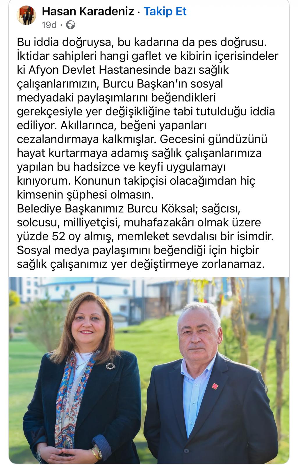 Cumhuriyet Halk Partisi (CHP) Afyonkarahisar İl Başkanı Hasan Karadeniz, Afyon Devlet Hastanesinde bazı sağlık çalışanlarının Belediye Başkanı Burcu Köksal’ın sosyal medya paylaşımlarını beğendikleri gerekçesiyle yer değişikliğine tabi tutulduğunu öne sürdü. Karadeniz, söz konusu iddianın doğru olması durumunda, iktidarın sağlık çalışanlarına yönelik "hadisiz ve keyfi" bir uygulama gerçekleştirdiğini ifade etti.