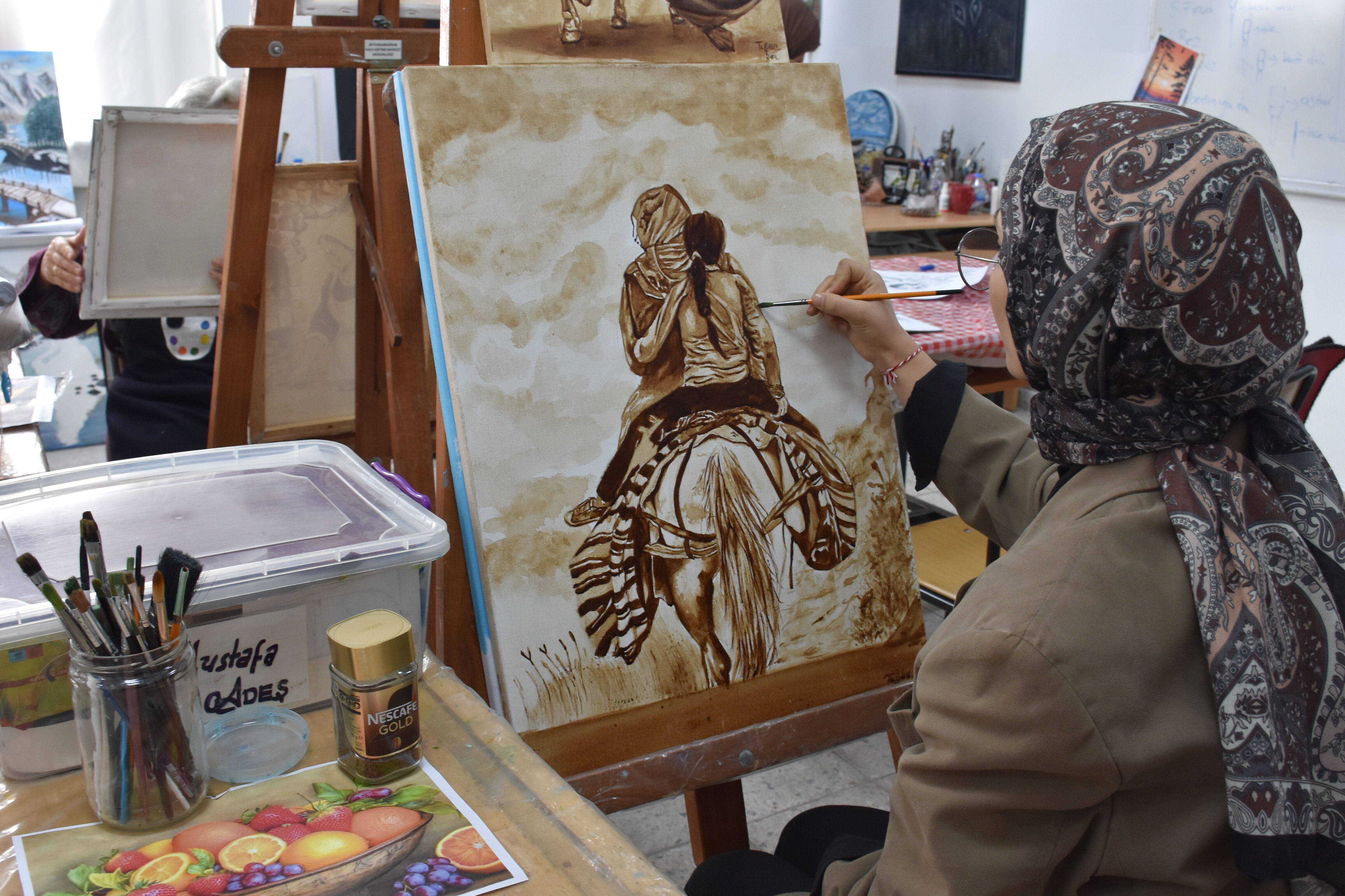 Halk Eğitim Merkezi Müdürü Abdullah Cemal Tola da bu yıl ilk kez kahve ile gerçekleştirilen bir resim kursu açtıklarını belirtti. Kahvenin genellikle lokum eşliğinde içildiğini hatırlatan Tola, bu kursta ise kahvenin tuvale işlendiğini belirterek, “Kursiyerler fırçayı kahveyle buluşturdu, ortaya gerçekten etkileyici eserler çıktı.” dedi.