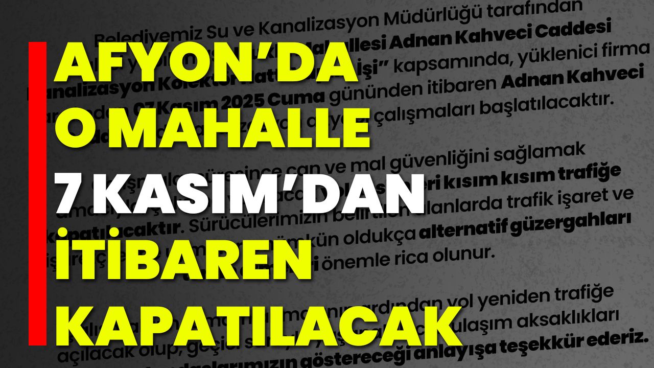 Afyonkarahisar Belediyesi’nden yapılan açıklamada, Su ve Kanalizasyon Müdürlüğü tarafından ihalesi gerçekleştirilen “Selçuklu Mahallesi Adnan Kahveci Caddesi Kanalizasyon Kolektör Hattı Yapım İşi” kapsamında çalışmaların 07 Kasım 2025 Cuma günü itibarıyla başlayacağı bildirildi. Açıklamada, yüklenici firma tarafından yürütülecek çalışmaların Adnan Kahveci Caddesi genelinde gerçekleştirileceği ifade edildi.