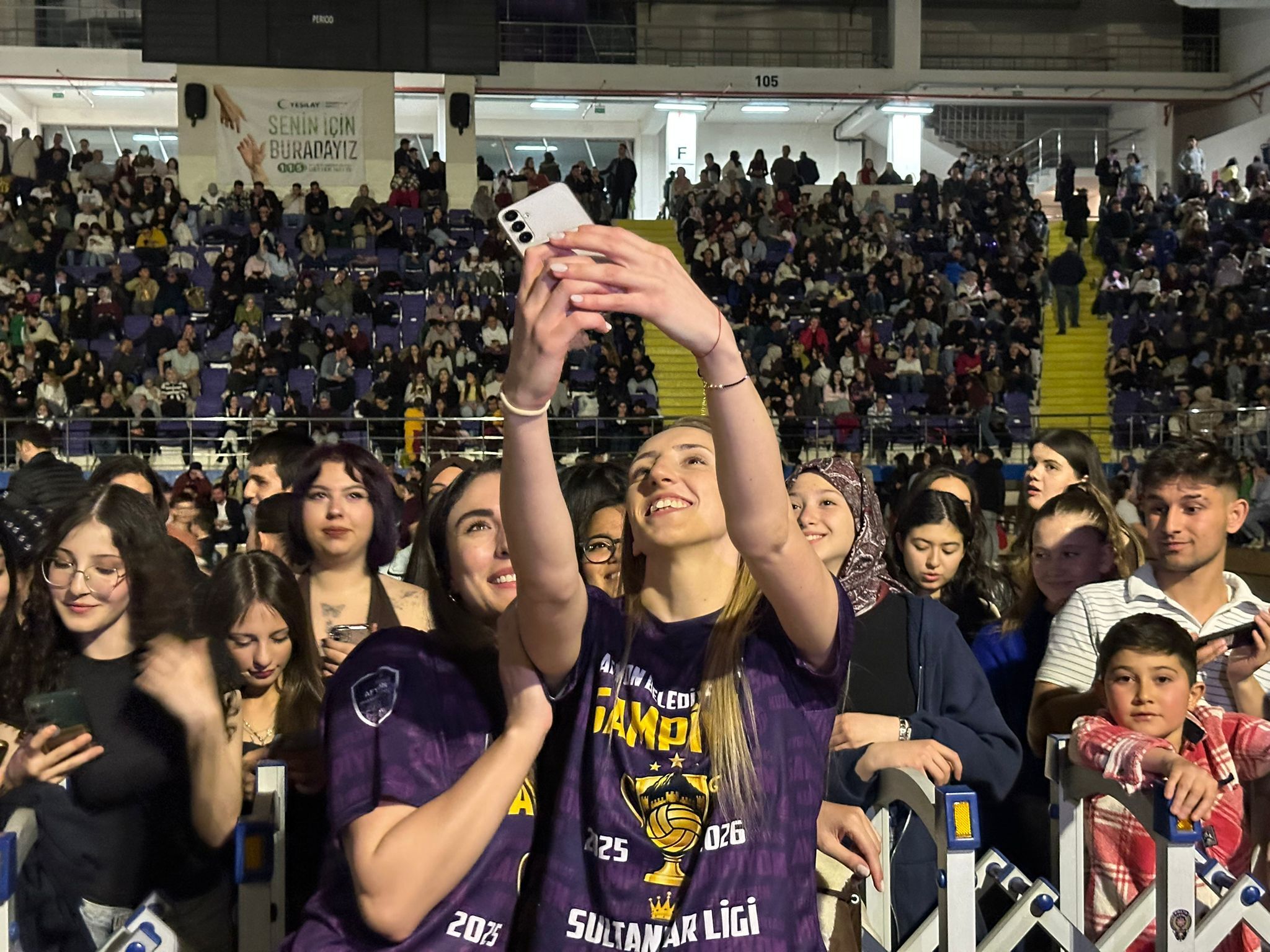 “Zaferin Sultanları” için düzenlenen kutlama programı, büyük bir coşkuya sahne oldu. Sultanlar Ligi’ne yükselerek önemli bir başarıya imza atan takım için organize edilen gecede, vatandaşlar salonu doldurdu. Programın ilerleyen saatlerinde sahne alan sanatçı Gökçe’nin konseriyle coşku daha da arttı.