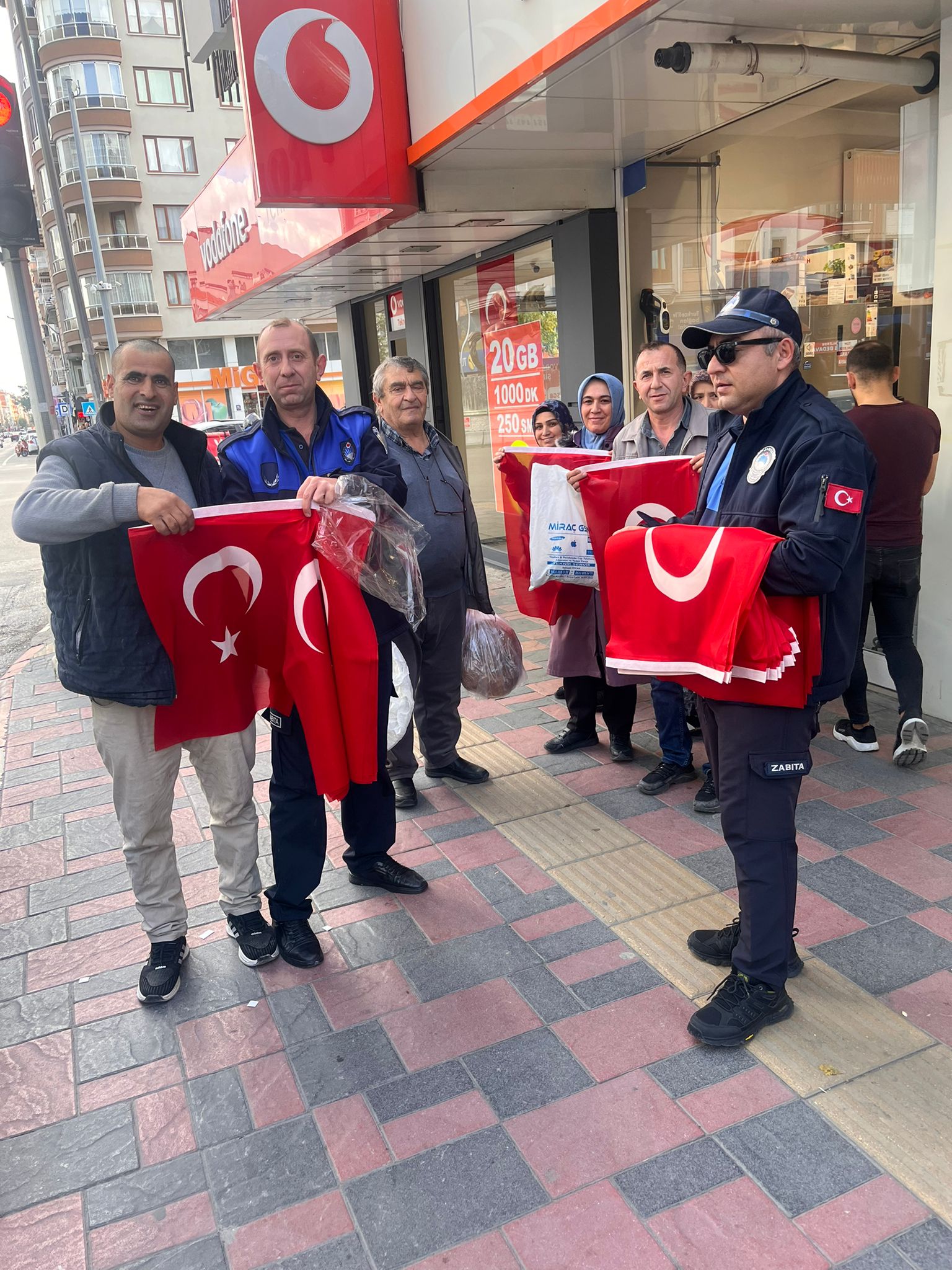 Afyonkarahisar Belediyesi Zabıta Müdürlüğü ekipleri, 29 Ekim Cumhuriyet Bayramı kapsamında kent merkezinde esnafa ve vatandaşlara Türk bayrağı hediye etti. Cumhuriyet’in simgesi olan al bayraklarla süslenen caddeler, kırmızı-beyaz renklere büründü.