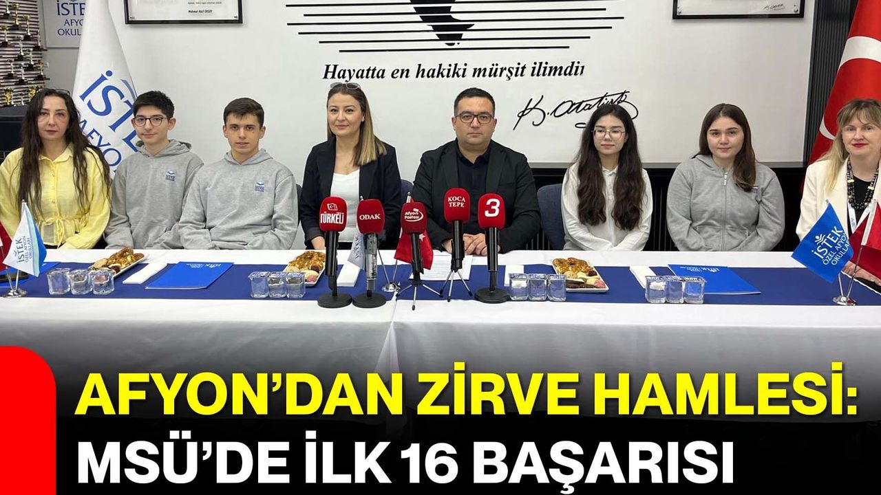 İstek Afyon Okulları öğrencilerinin MSÜ 2026 sonuçlarına ilişkin başarıları dolayısıyla okulda basın açıklaması düzenlendi. Açıklamayı okul kurucu temsilcisi Hasan Aktan yaptı. Açıklamasına teşekkürle başlayan Aktan, “Başta İl Milli Eğitim Müdürümüz Miraç Sünnetçi’ye ve Milli Eğitim Müdür Yardımcımız ve Özel Öğretim Şube Müdürümüz Mevlüt Çınar’a ve eğitim sürecimize destek olan tüm müdür yardımcılarımıza kıymetli katkıları için teşekkür ederiz” dedi.