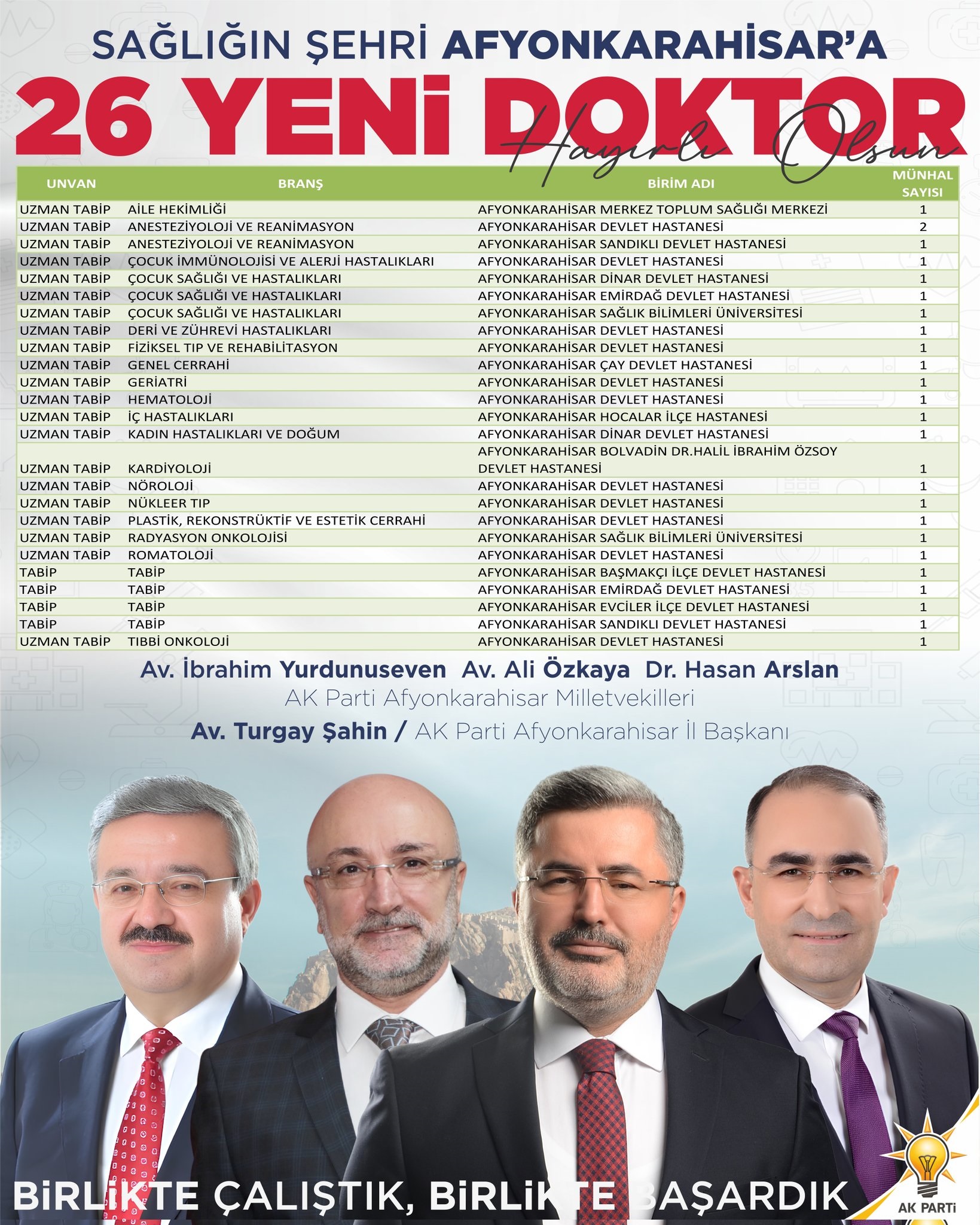 Türkiye Büyük Millet Meclisi (TBMM) Başkanlık Divanı Üyesi ve AK Parti Afyonkarahisar Milletvekili Av. İbrahim Yurdunuseven , Av. Ali Özkaya, Dr. Hasan Arslan ve İl Başkanı Turgay Şahin kent genelinde sağlık hizmetlerinin güçlendirilmesi amacıyla 26 yeni doktorun göreve başladığını açıkladı. Yeni atamalarla birlikte merkezden ilçelere kadar tüm sağlık kurumlarında vatandaşlara daha nitelikli ve erişilebilir hizmet sunulacağını belirtti.