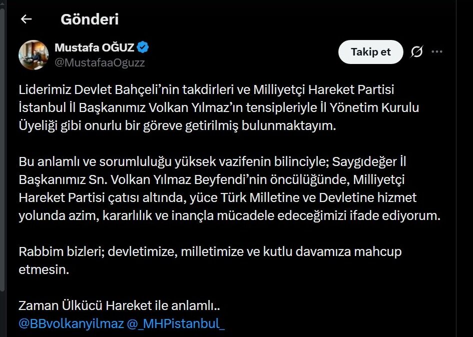 Mustafa Oğuz, sosyal medya hesabından yaptığı paylaşımda MHP İstanbul İl Başkanı Volkan Yılmaz ile birlikte çekilen fotoğrafına yer vererek görevlendirmeye ilişkin değerlendirmelerde bulundu. Oğuz açıklamasında, Milliyetçi Hareket Partisi Genel Başkanı Devlet Bahçeli’nin takdirleri ve İl Başkanı Volkan Yılmaz’ın tensipleriyle göreve getirildiğini belirterek, “Bu anlamlı ve sorumluluğu yüksek görevin bilinciyle, MHP çatısı altında Türk milletine ve devletine hizmet yolunda azim ve kararlılıkla çalışacağız. Rabbim bizleri devletimize ve davamıza mahcup etmesin” ifadelerini kullandı.