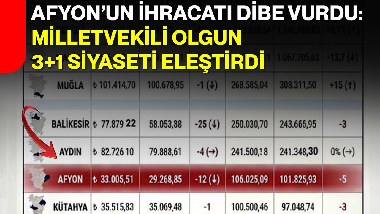 Milletvekili Olgun, ihracat düşüşünü “3+1 siyaset” anlayışı ve AK Parti Afyonkarahisar milletvekilleri ile il başkanının politika tercihleriyle ilişkilendirdi. Milletvekili Olgun, “Afyonkarahisar’ın ekonomik potansiyeli kullanılmıyor. AK Parti Afyon milletvekilleri ve il başkanının bu konudaki ihmali şehrin ihracat rakamlarına yansıyor” diyerek eleştirisini sürdürdü.