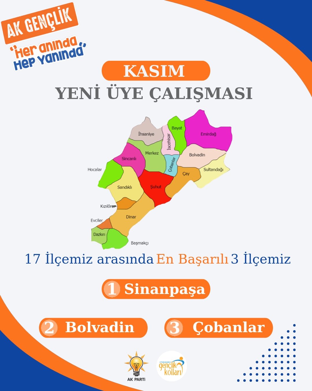 Gençlik Kolları tarafından yapılan açıklamada, üye çalışmalarında en yüksek performansı gösteren ilçeler de paylaşıldı. Buna göre Sinanpaşa birinci, Bolvadin ikinci, Çobanlar ise üçüncü sırada yer aldı. İl teşkilatı, gösterdikleri gayret ve özveri nedeniyle tüm ilçe örgütlerine teşekkür etti.