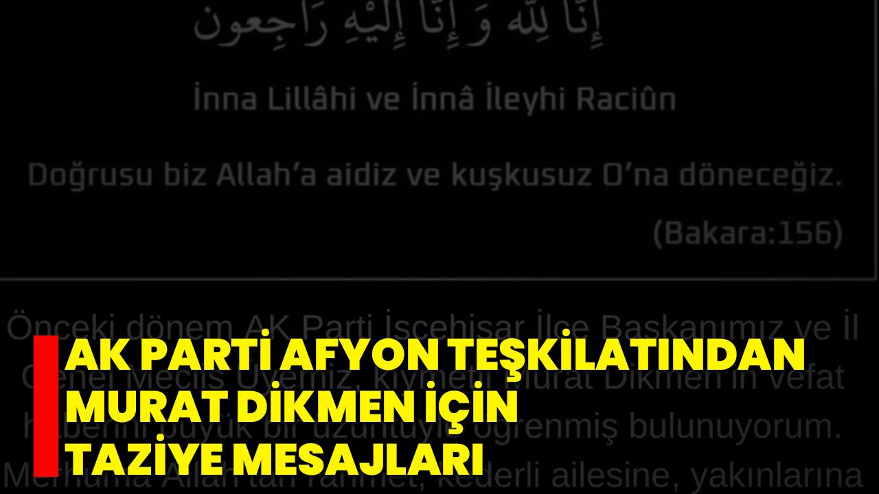 “Önceki dönem AK Parti İscehisar İlçe Başkanımız, İl Genel Meclis Üyemiz ve İl Yönetim Kurulu Üyemiz kıymetli Murat Dikmen’in vefat haberini büyük bir üzüntüyle öğrendim. Dava adamlığı, samimiyeti ve millete hizmet aşkıyla iz bırakan Murat ağabeyimize Allah’tan rahmet; ailesine, sevenlerine ve teşkilatımıza sabırlar diliyorum. Mekânı cennet, makamı âli olsun.”