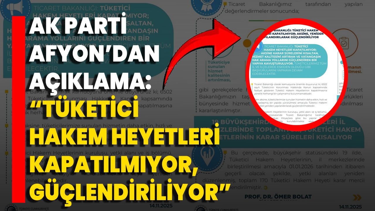 AK Parti Afyonkarahisar teşkilatı, Tüketici Hakem Heyetleriyle ilgili son günlerde kamuoyunda yer alan iddialara ilişkin açıklamada bulundu. Yapılan açıklamada, tüketici heyetlerinin kapatılmasının söz konusu olmadığı, tam tersine vatandaşların başvurularına daha hızlı çözüm üretmeyi amaçlayan modern bir sisteme geçiş yapıldığı vurgulandı.