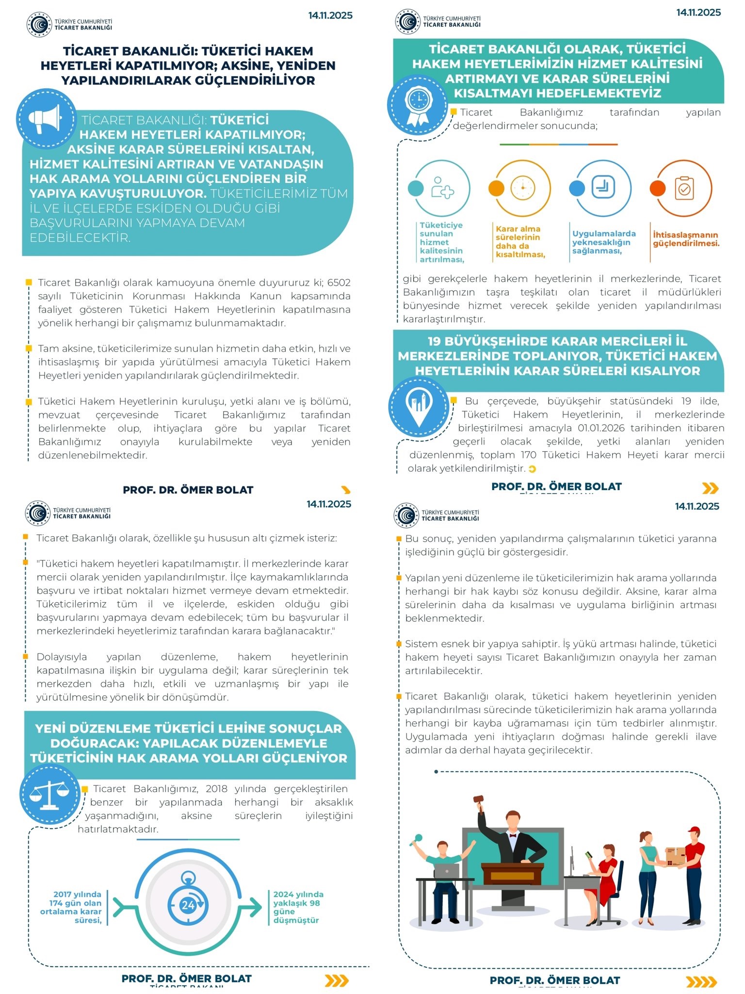“Tüketici Hakem Heyetleri kapatılmıyor; tam tersine daha etkin, hızlı ve vatandaş odaklı bir yapıya kavuşturuluyor. Bu adım, hemşehrilerimizin mağduriyet yaşamadan daha hızlı sonuç alabilecekleri modern bir sisteme geçilmesi ve tüketici süreçlerinin daha güçlü şekilde korunması adına önemli bir düzenlemedir.”