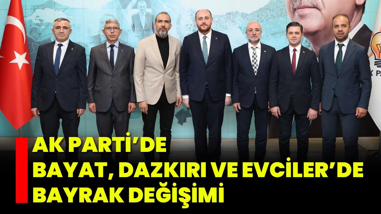 AK Parti Afyonkarahisar teşkilatında yeni dönem başladı. AK Parti Genel Başkan Yardımcısı ve Teşkilat Başkanı Ahmet Büyükgümüş’ün başkanlığında, İl Başkanı Av. Turgay Şahin ve il başkan yardımcılarının katılımıyla Bayat, Dazkırı ve Evciler ilçe teşkilatlarında bayrak değişimi gerçekleştirildi. Toplantıda yeni göreve getirilen ilçe başkanlarına başarı dilekleri iletilirken, AK Parti teşkilatı için bugüne kadar görev yapan isimlere emekleri dolayısıyla teşekkür edildi.