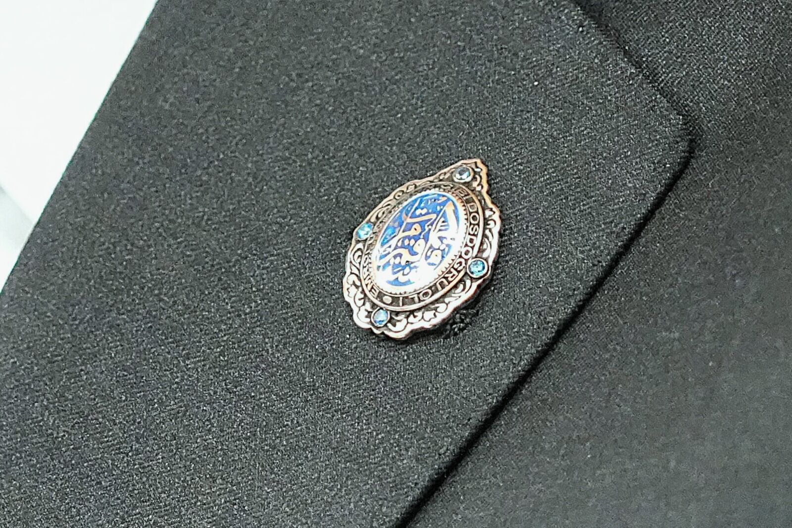 Yüzük tasarımında, “London Blue Topaz” olarak adlandırılan topaz cinsi, pırlanta kesim özel bir taş kullanıldı. Orta ila koyu tonlarda mavi renge sahip olan bu taşın, sadakat ve bilgelik sembolü olduğu ifade ediliyor. Yüzüğün üst kısmında ise Hud Suresi 112. ayetinden alınan “Emrolunduğun gibi dosdoğru ol” ifadesi, günümüz alfabesiyle Türkçe olarak işlendi. Ayetin taşın çevresini dairesel biçimde sarması, tasarıma manevi bir derinlik kazandırdı. Ayrıca yüzüğün yan yüzeylerinde de aynı ayetin hat sanatı estetiği gözetilerek kabartma (rölyef) tekniği ile işlendiği, London Blue Topaz taşlarla süslemelerin yapıldığı görüldü.