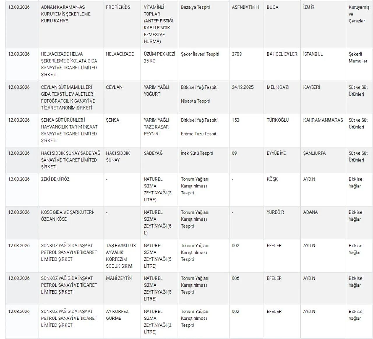 Bakanlığın yayımladığı listede “Sağlığı Tehlikeye Düşürecek Gıdalar” ve “Taklit ve Tağşiş Yapılan Gıdalar” başlıkları altında birçok ürün ve firma yer aldı. Açıklanan listede kıyma, bal, sucuk, zeytinyağı ve yoğurt gibi sık tüketilen gıda ürünlerinin bulunduğu görüldü.