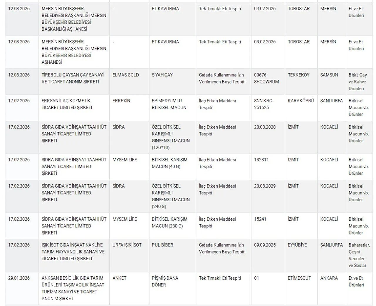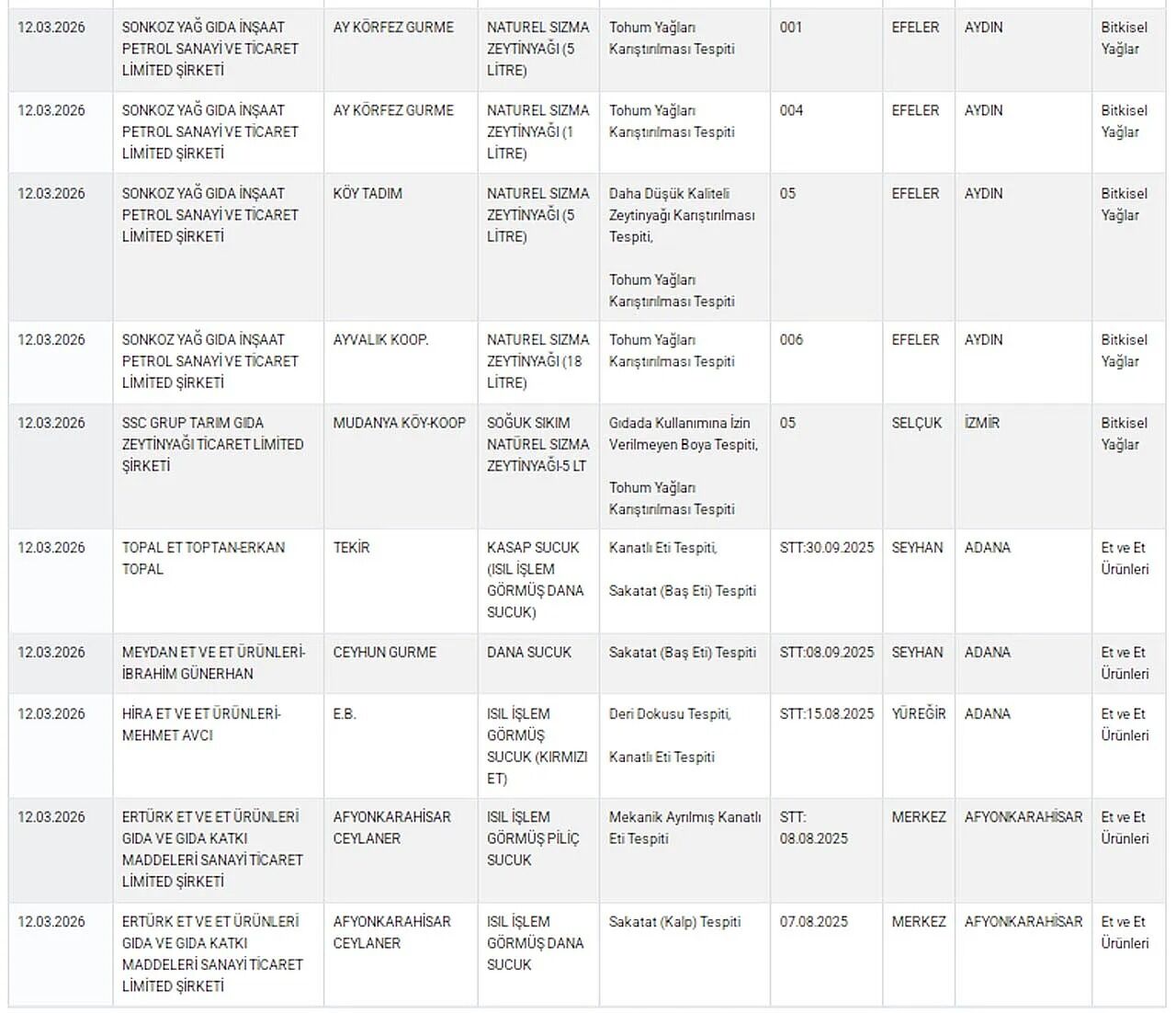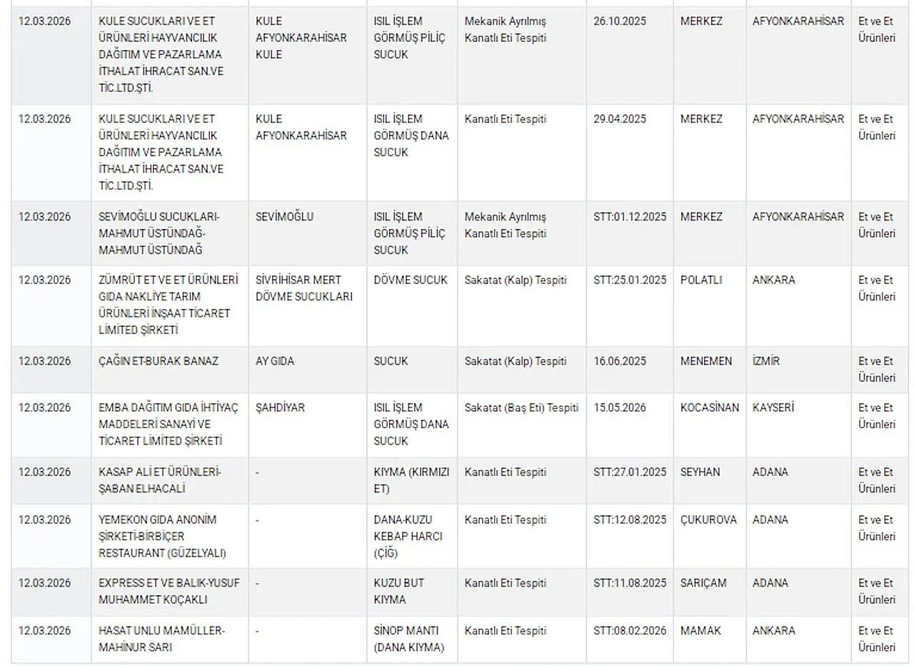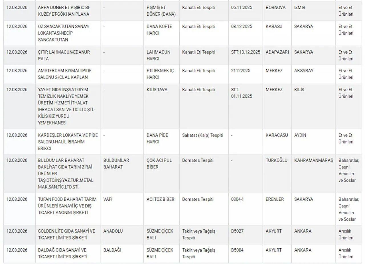 Listede yer alan dikkat çekici tespitlerden biri de Mersin Büyükşehir Belediyesine ait bir aşhanede yapılan denetim oldu. Yapılan incelemelerde et kavurma ürününde tek tırnaklı hayvan eti bulunduğu tespit edildi. Tarım ve Orman Bakanlığı, gıda güvenliğini sağlamak amacıyla denetimlerin aralıksız sürdürüleceğini ve mevzuata aykırı üretim yapan firmaların kamuoyuna duyurulmaya devam edeceğini bildirdi.