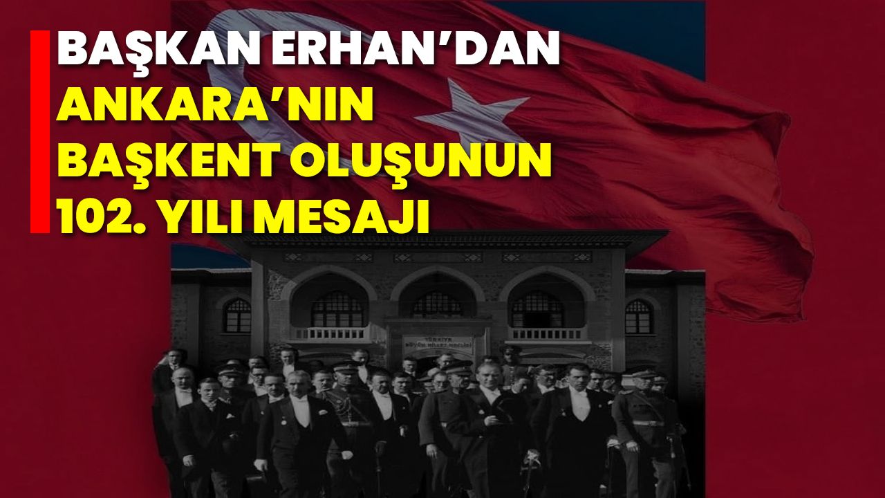 Başkan Erhan mesajında, “Cumhuriyetimizin kalbi, bağımsızlığımızın simgesi Ankara’nın başkent oluşunun 102. yıl dönümünde; ebedi Başkomutanımız Gazi Mustafa Kemal Atatürk’ü ve tüm şehitlerimizi rahmet ve minnetle anıyoruz” ifadelerini kullandı.