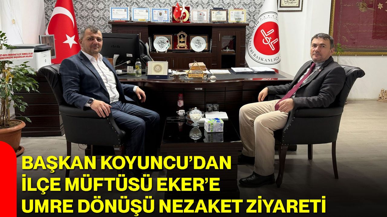 Afyonkarahisar Emirdağ Belediye Başkanı Serkan Koyuncu, Umre ibadetini tamamlayarak ilçeye dönen İlçe Müftüsü Cihan Eker’e nezaket ziyaretinde bulundu.