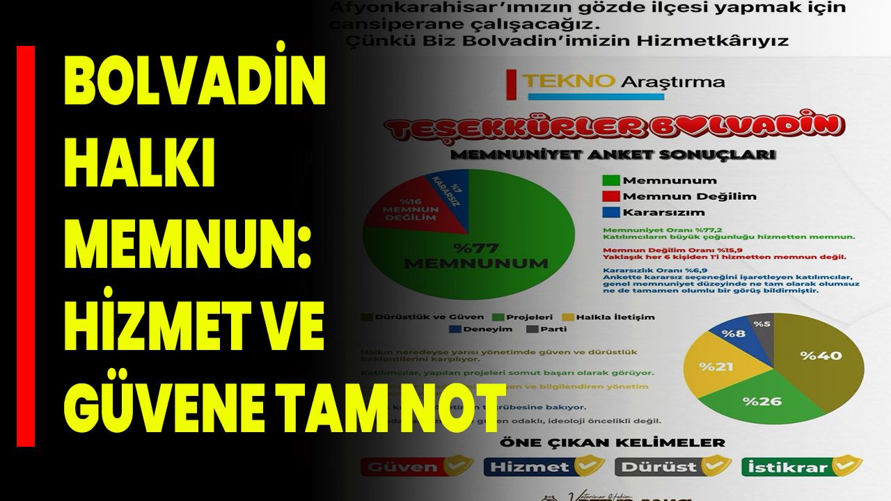 Anket sonuçlarına göre, katılımcıların %77’si belediye hizmetlerinden memnun, %16’sı memnun değil, %7’si ise kararsız olduğunu ifade etti. Yaklaşık her 6 kişiden 1’i hizmetlerden memnun olmadığını belirtirken, genel tablo Bolvadin Belediyesi’ne olan güvenin yüksek olduğunu ortaya koydu.