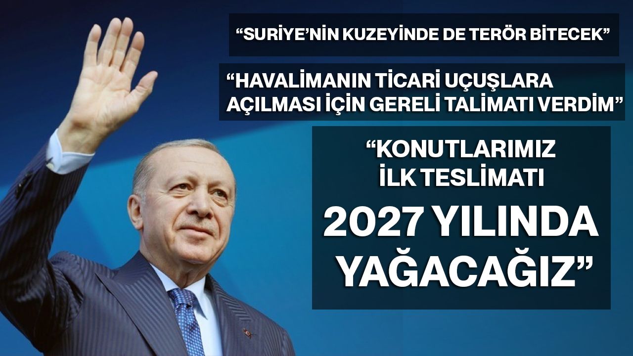 Erdoğan, "Ev sahibi Türkiye" sloganıyla bir konut projesi başlattık. Projemizde ülkemiz genelinde toplam 500 bin konut inşa edeceğiz. Yüzyılın konut projesinin kura çekimlerine geçen ay başladık. Bugün de Aydın merkezde 2 bin 100, ilçelerde 4 bin 873 olmak üzere toplam 6 bin 973 konutun kurasını çekiyoruz. Konutlarımızın ilk teslimatlarını 2027 yılının Mart ayından itibaren yapmak niyetindeyiz. Rabbim bu konutların anahtarların hak sahibi kardeşlerime bizzat teslim etmeyi nasip eylesin" dedi.