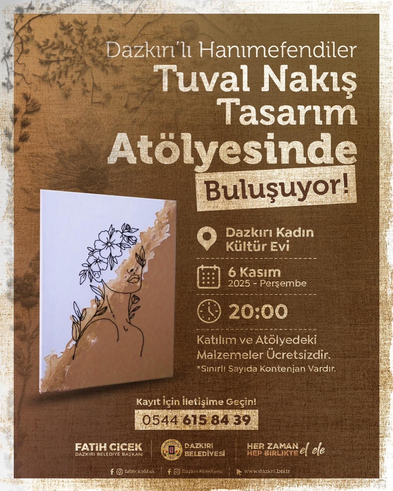 Başkan Çiçek, etkinlikle ilgili yaptığı açıklamada şu ifadelere yer verdi: “Dazkırı’nın ilmek ilmek işleyen kadınları, Tuval Nakış Tasarım Atölyemizde buluşuyor. Her nakış bir hikâye, her kadın bir ilham! Haydi hanımlar, birlikte üretelim, birlikte güzelleştirelim.”