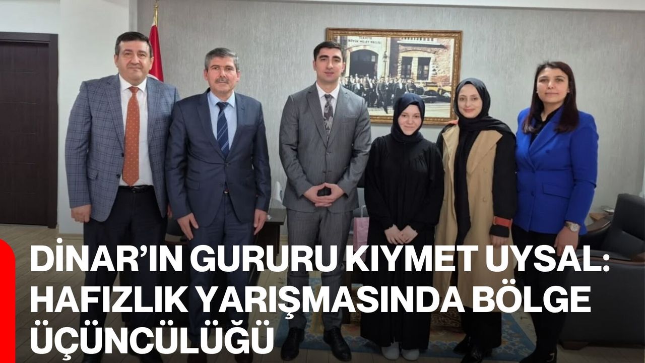 Şehit Şükrü Bayrakcı Hafız İmam Hatip Ortaokulu ve Nene Hatun Kız Kur’an Kursu öğrencisi Kıymet Uysal, sergilediği üstün performansla bölge üçüncüsü olarak ilçesini gururlandırdı. Milli Eğitim Bakanlığı Din Öğretimi Genel Müdürlüğü tarafından kız öğrenciler arasında düzenlenen Hafızlık Yarışması bölge finali Antalya’da gerçekleştirildi. Yarışmada Dinar’ı temsil eden Kıymet Uysal, bölge üçüncüsü derecesiyle büyük bir başarıya imza attı.
