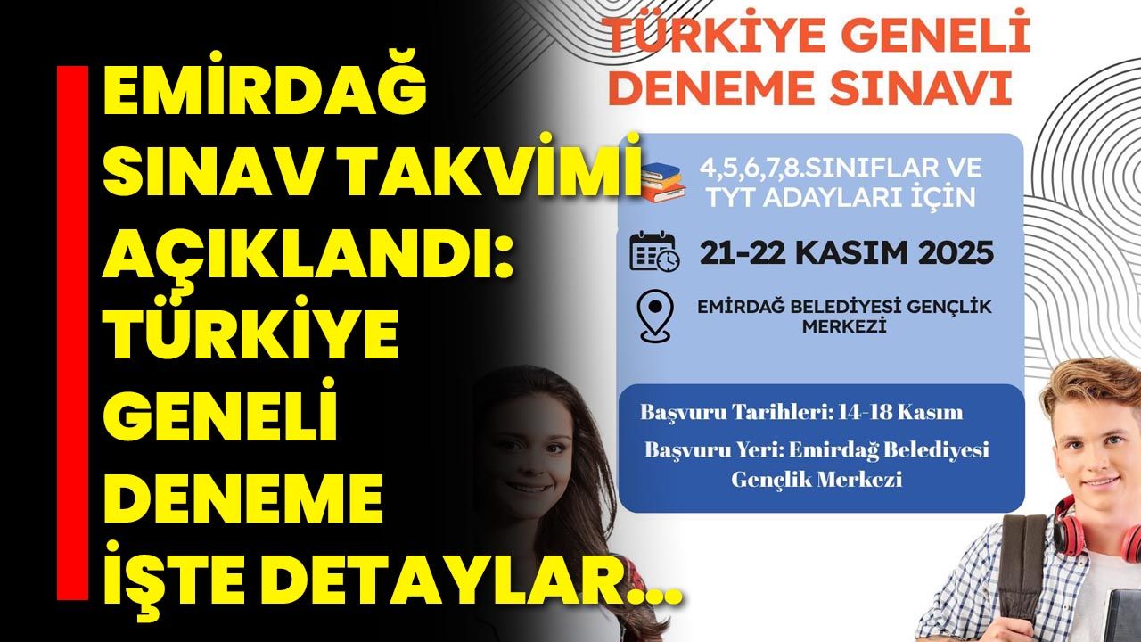 Deneme sınavı, 21–22 Kasım 2025 tarihlerinde Emirdağ Belediyesi Gençlik Merkezi’nde yapılacak. Programa katılmak isteyen öğrenciler, 14–18 Kasım 2025 tarihleri arasında başvurularını yine Gençlik Merkezi’ne yapabilecek.