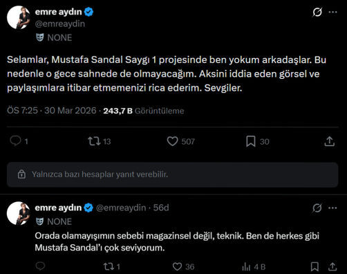 Etkinlikte yer alıp almayacağı merak edilen Emre Aydın, sosyal medya hesabından yaptığı açıklamada projede bulunmadığını ve o gece sahneye çıkmayacağını ifade etti. Aydın, adına dolaşıma giren görsel ve paylaşımlara itibar edilmemesi gerektiğini vurgulayarak, katılamama nedeninin magazinsel değil teknik sebeplerden kaynaklandığını belirtti.