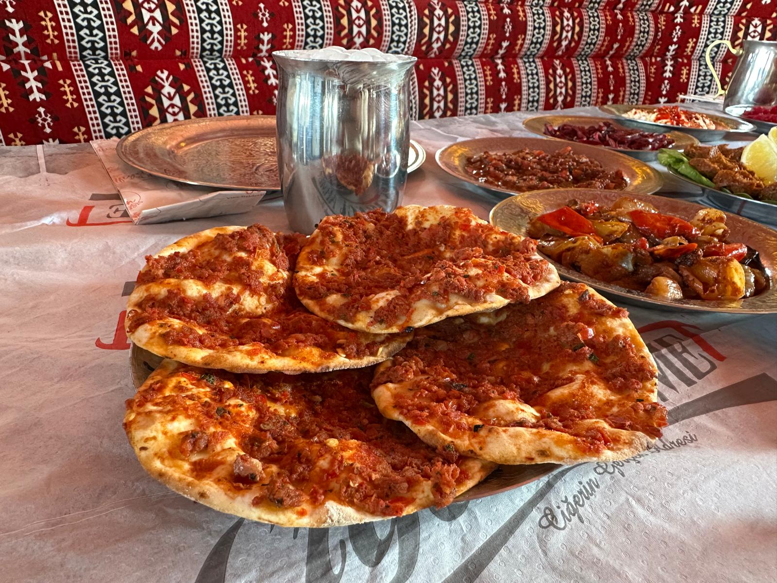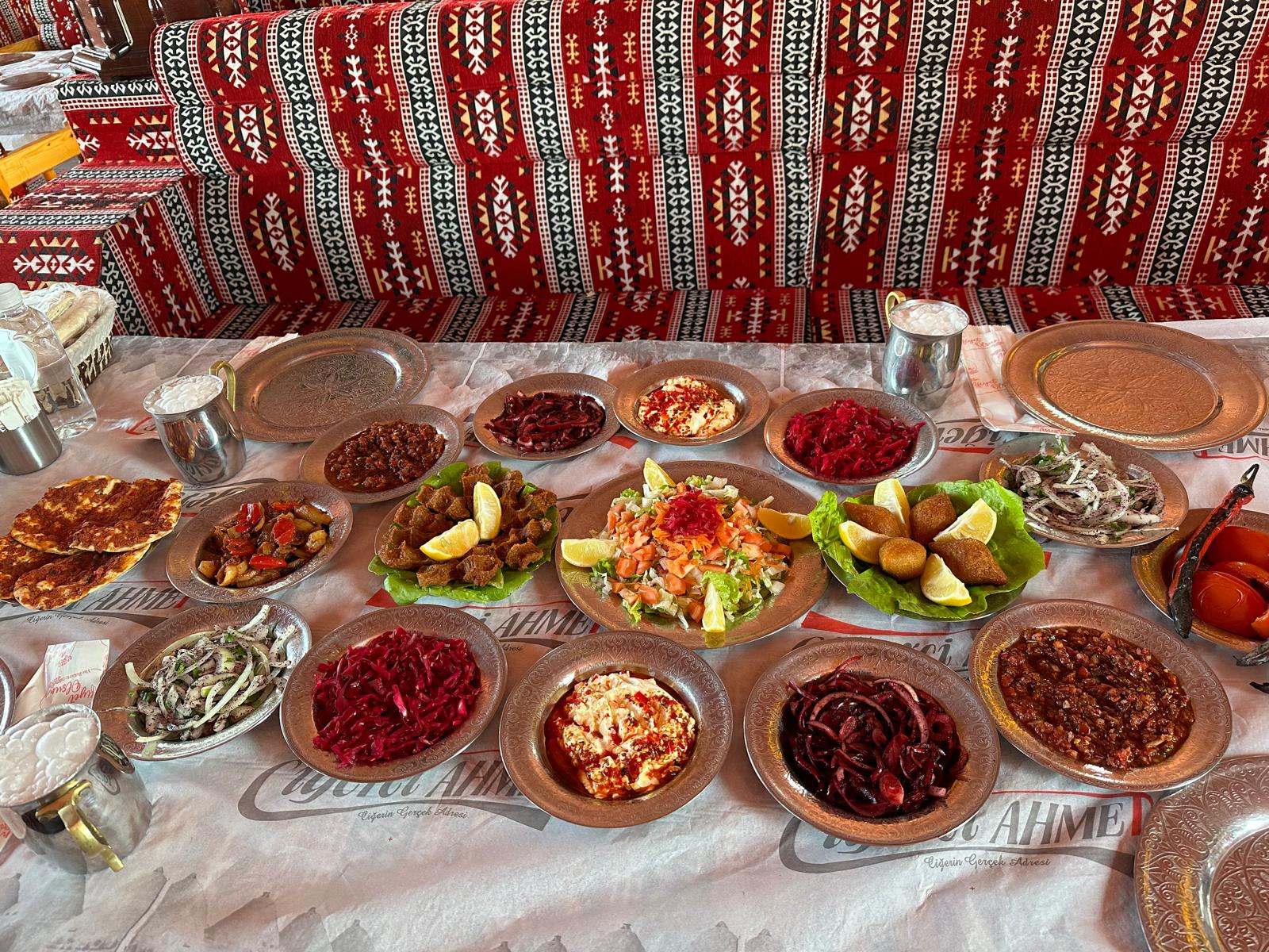 “13 çeşit mezemiz var. Meze çeşitlerimiz salata, mevsim salata, yeşillik, köz domates, köz biber, acılı ezme, tatlı soğan ki bunun tarifi sadece bizde mevcut, sumaklı soğan, pişmiş soğan, acılı atom, içli köfte, fındık lahmacun, çiğ köfte, mor lahana, havuç tarator veriyoruz.”