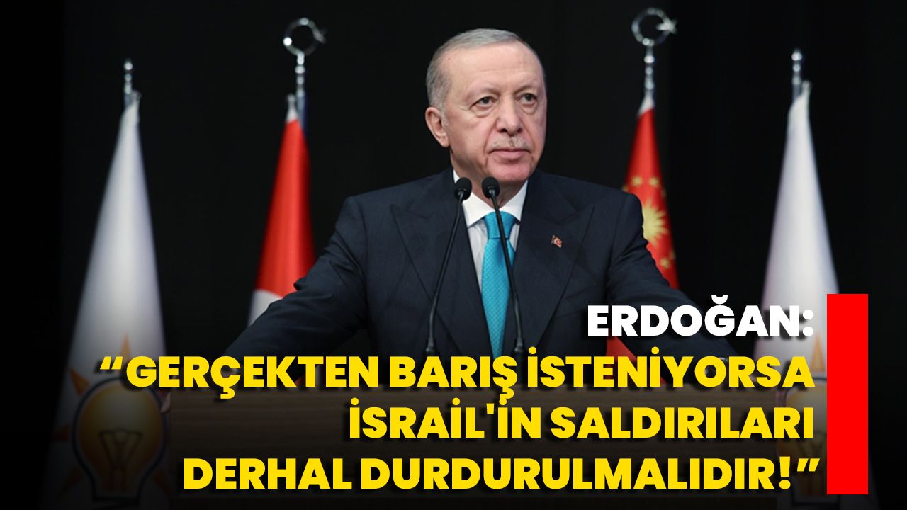 Cumhurbaşkanı Recep Tayyip Erdoğan, İsrail'in saldırılarına ilişkin, "Barışın tüm yükünü Hamas'a ve Filistinlilere yüklemek ne adildir ne de gerçekçi bir yaklaşımdır. Gerçekten barış isteniyorsa İsrail'in saldırıları derhal durdurulmalıdır." dedi.