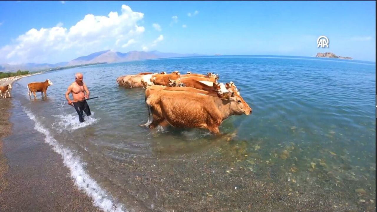 Gevaş ilçesinde çobanlık yapanlar, büyükbaş hayvanlarını göl kıyısındaki bölgelerde otlatıyor. Çobanlar, Akdamar Adası'nın karşı kıyılarında gün boyu besledikleri hayvanların, sıcaklığın arttığı saatlerde de serinlemeleri için Van Gölü'ne girmesini sağlıyor. Bir süre suda kaldıktan sonra gölden çıkarılan hayvanlar, tekrar otlatılarak sahiplerine teslim ediliyor. AA