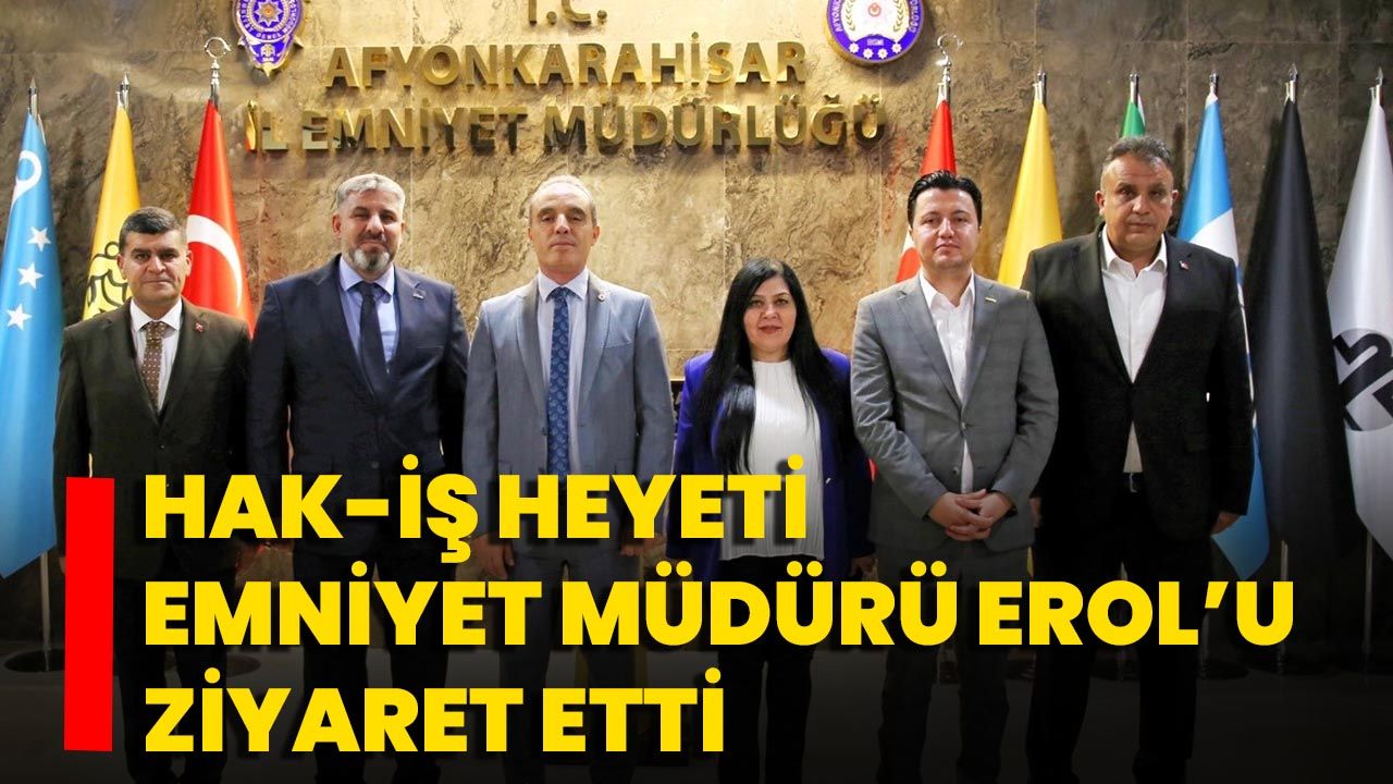 Afyonkarahisar Hak-İş Konfederasyonu İl Başkanı ve Öz Sağlık-İş Sendikası Şube Başkanı İbrahim Gürbüz, Hizmet-İş Sendikası Şube Başkanı Kemal Erkuş, Şube Başkan Yardımcıları Ceylan Evsen ile Selçuk Turmuş ve Öz Sağlık-İş Sendikası Başkan Yardımcısı Canan Eş, İl Emniyet Müdürü Ahmet Birtan Erol’u makamında ziyaret etti.