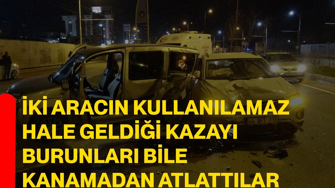 Kaza, saat 21.15 sıralarında Malatya-Elazığ karayolu Battalgazi Altgeçit girişi mevkiinde meydana geldi. Edinilen bilgilere göre, Elazığ istikametine seyir halinde olan sürücüleri öğrenilemeyen 44 AFT 715 plakalı Volkswagen marka otomobil ile aynı yönde ilerleyen 44 AEP 066 plakalı Fiat marka hafif ticari araç tali yoldan ana yola katılım noktasında çarpıştı. Kazada araçlarda büyük çaplı maddi hasar oluşurken her iki sürücü de kazayı yara almadan atlattı. Kazayla ilgili inceleme başlatıldı.