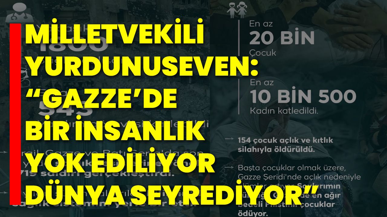 Milletvekili Yurdunuseven, paylaşımının sonunda, “Gazze’de bir insanlık yok ediliyor, tüm dünya bunu seyrediyor ve Katil İsrail mutlaka hak ettiği sonu yaşayacak inşallah” ifadeleriyle uluslararası kamuoyuna sessiz kalmamaları çağrısında bulundu.