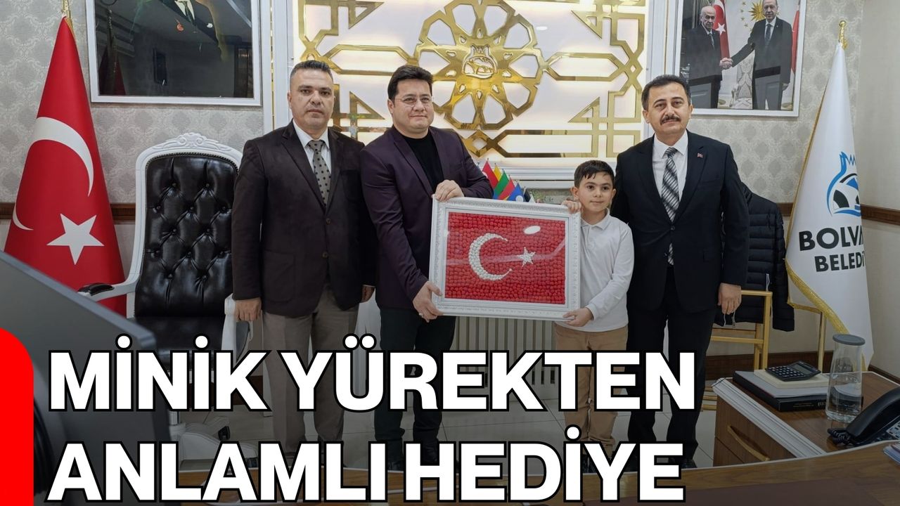Bolvadin Alkasan İlkokulu öğrencisi Mevlüt Kerim Göç, kendi hazırladığı el emeği Türk Bayrağı’nı Bolvadin Belediye Başkanı Derviş Aynacı’ya takdim etti. Anlamlı ziyaret kapsamında İlçe Milli Eğitim Müdürü Mehmet Ali Keleş ve Okul Müdürü İsmail Cem Ciğerci de hazır bulundu.