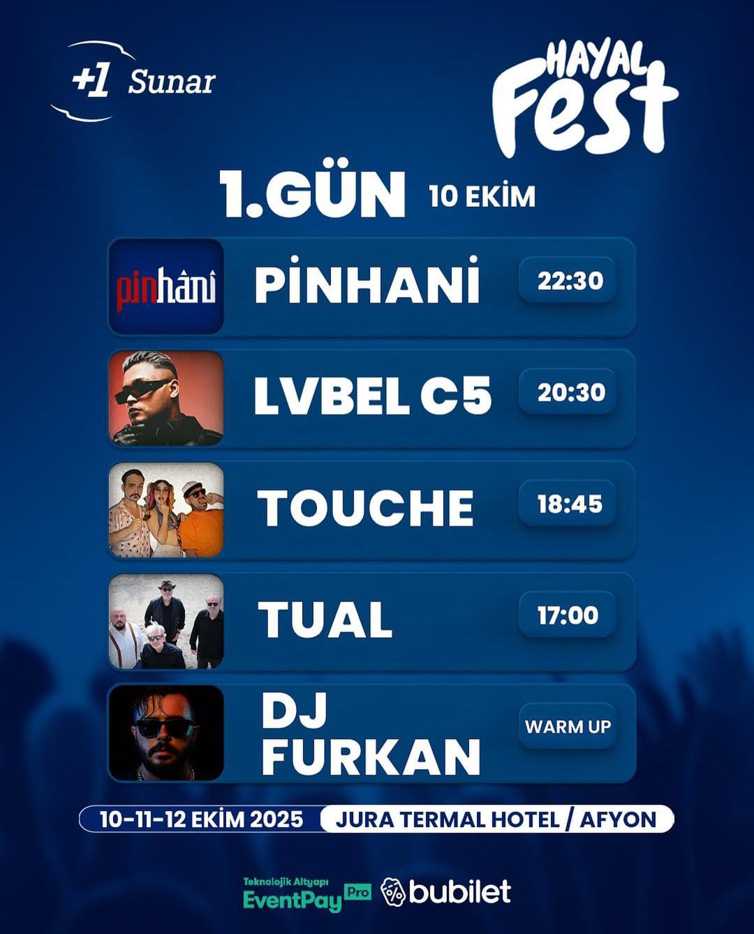 Festivalin ilk gününde DJ Furkan’ın ısınma performansı ile başlayacak müzik şöleni, ardından sahne alacak Tual (17.00), Touche (18.45), Lvbel C5 (20.30) ve Pinhani (22.30) konserleriyle devam edecek. Hayal Fest’in açılış günü, farklı tarzların buluştuğu dopdolu bir müzik akşamına ev sahipliği yapacak.