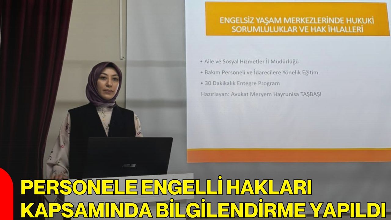 Afyonkarahisar Aile ve Sosyal Hizmetler İl Müdürlüğüne bağlı Afyonkarahisar Engelsiz Yaşam Bakım ve Rehabilitasyon Merkezinde görev yapan personelin bilgi, beceri ve mesleki gelişimlerinin desteklenmesi amacıyla eğitim faaliyeti düzenlendi. Eğitim programı kapsamında Avukat Meryem Hayrunisa Taşbaşı tarafından “Engelli Hakları ve Engelliler Hakkındaki Yönetmelikler” başlığı altında sunum yapıldı.