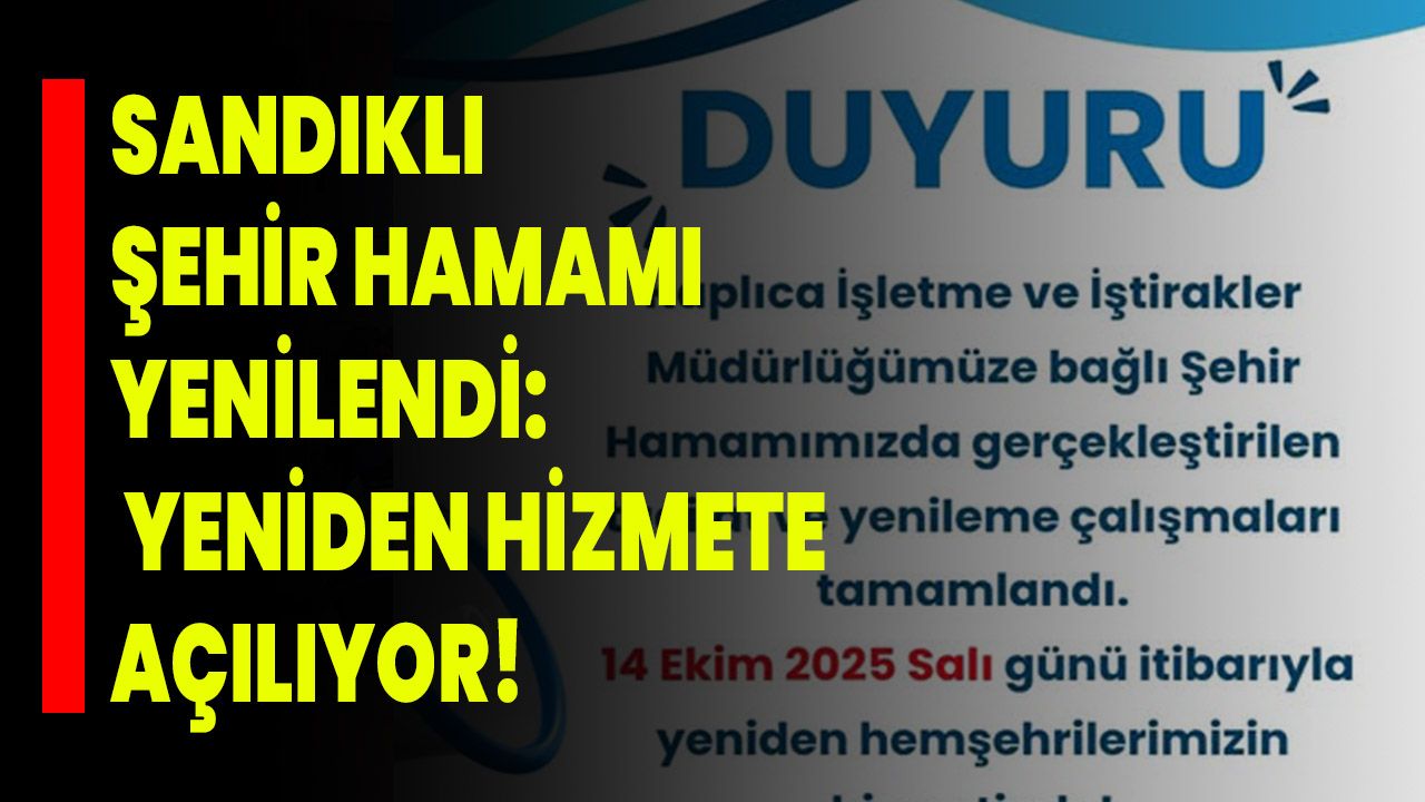 Belediyeden yapılan açıklamada, “Sandıklı Şehir Hamamı yenilendi! Kaplıca İşletme ve İştirakler Müdürlüğümüze bağlı Sandıklı Şehir Hamamımızda gerçekleştirilen tadilat ve yenileme çalışmaları tamamlandı. 14 Ekim 2025 Salı günü itibarıyla yeniden hemşehrilerimizin hizmetinde! Tüm çabamız Sandıklı için” ifadeleri yer aldı.