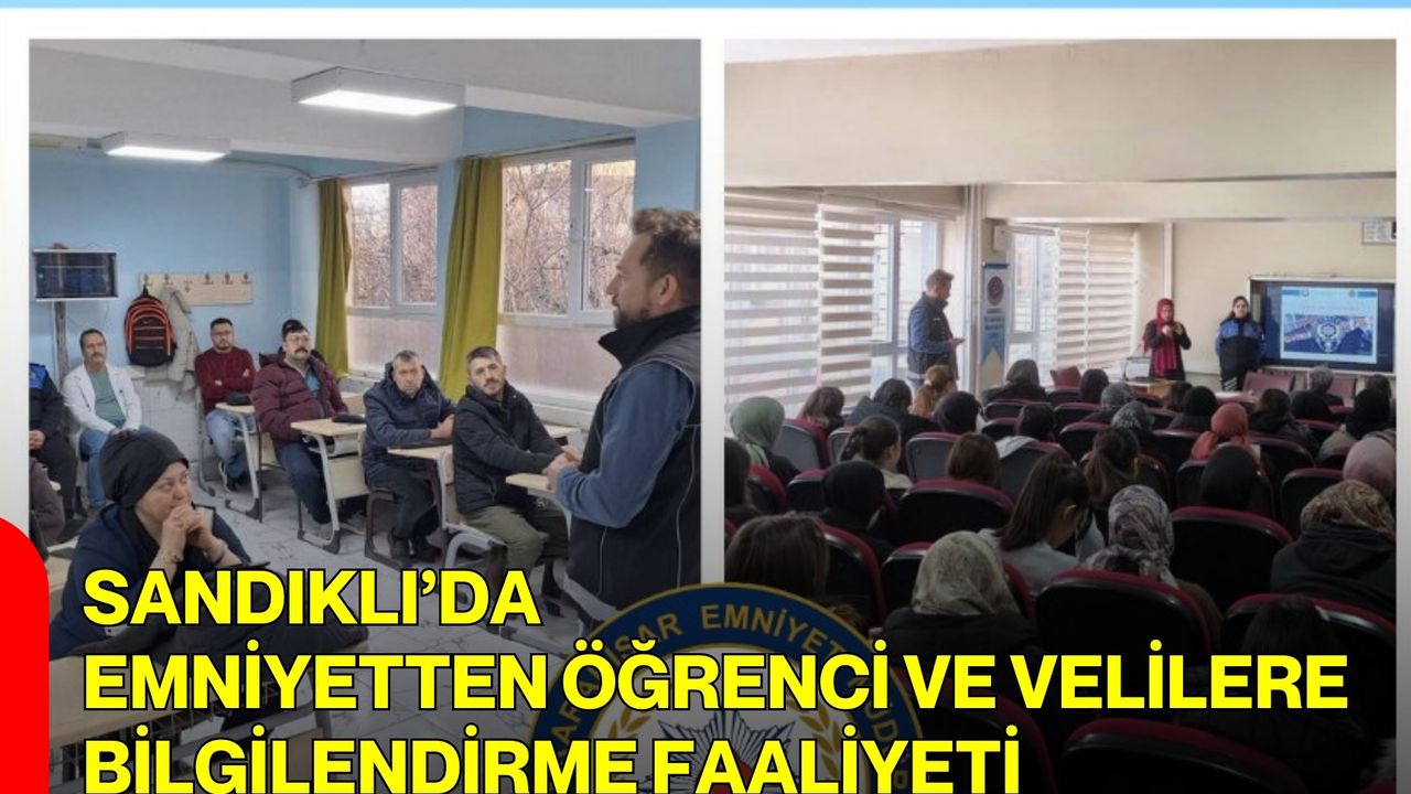 Afyonkarahisar İl Emniyet Müdürlüğü görevlilerince toplum destekli çalışmalar kapsamında Sandıklı ilçesinde çeşitli okullarda bilgilendirme faaliyetleri düzenlendi. Zübeyde Hanım Mesleki ve Teknik Anadolu Lisesi, Hüdai Mesleki ve Teknik Anadolu Lisesi, Türk Telekom Fen Lisesi, Ali Çetinkaya Ortaokulu, Kız Anadolu İmam Hatip Lisesi, Yavuz Selim Mesleki ve Teknik Anadolu Lisesi, Anadolu İmam Hatip Lisesi ile Şehit Orhan Mesleki ve Teknik Anadolu Lisesi’nde gerçekleştirilen programlara yoğun katılım sağlandı.