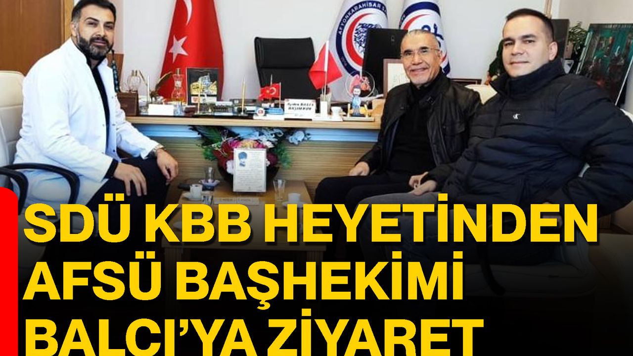 Süleyman Demirel Üniversitesi (SDÜ) Araştırma ve Uygulama Hastanesi Kulak Burun Boğaz Ana Bilim Dalından Prof. Dr. Erdoğan Okur ve Doç. Dr. Yusuf Çağdaş Kumbul, Afyonkarahisar Sağlık Bilimleri Üniversitesi (AFSÜ) Hastanesi Başhekimi Doç. Dr. Aydın Balcı’yı makamında ziyaret etti.