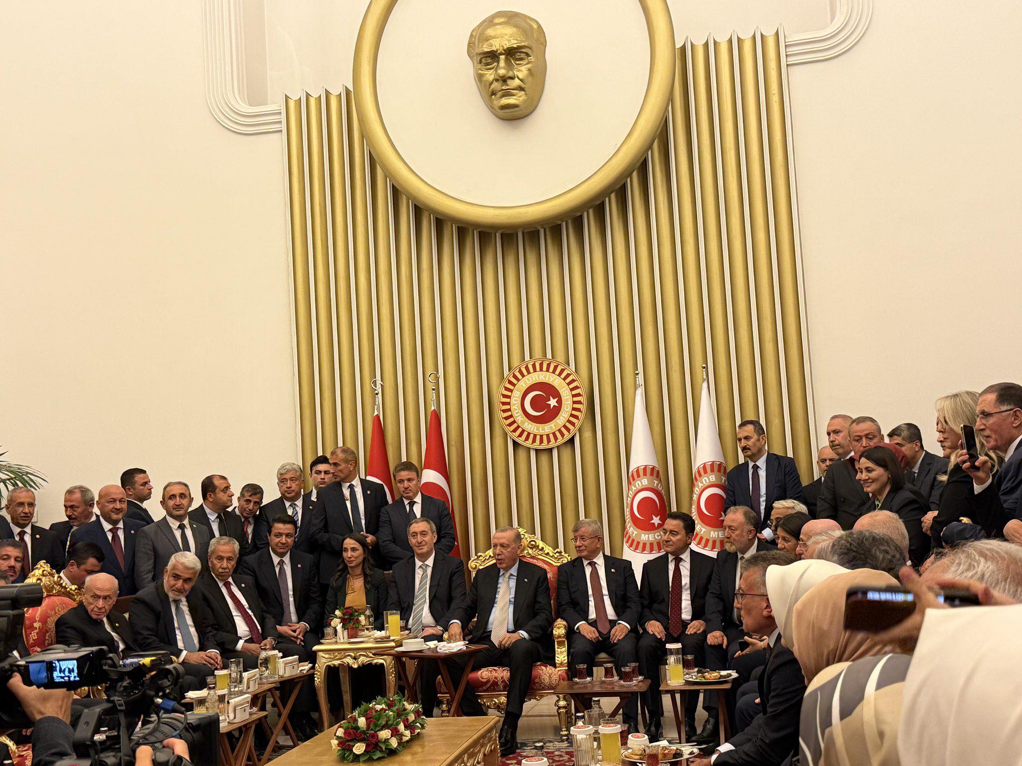 Cumhurbaşkanı Erdoğan burada, DEM Parti Eş Genel Başkanı Tuncer Bakırhan ve İmralı Heyeti Üyesi Mithat Sancar ile sohbet etti. Cumhurbaşkanı Erdoğan, MHP Genel Başkanı Devlet Bahçeli ile sohbet etti.