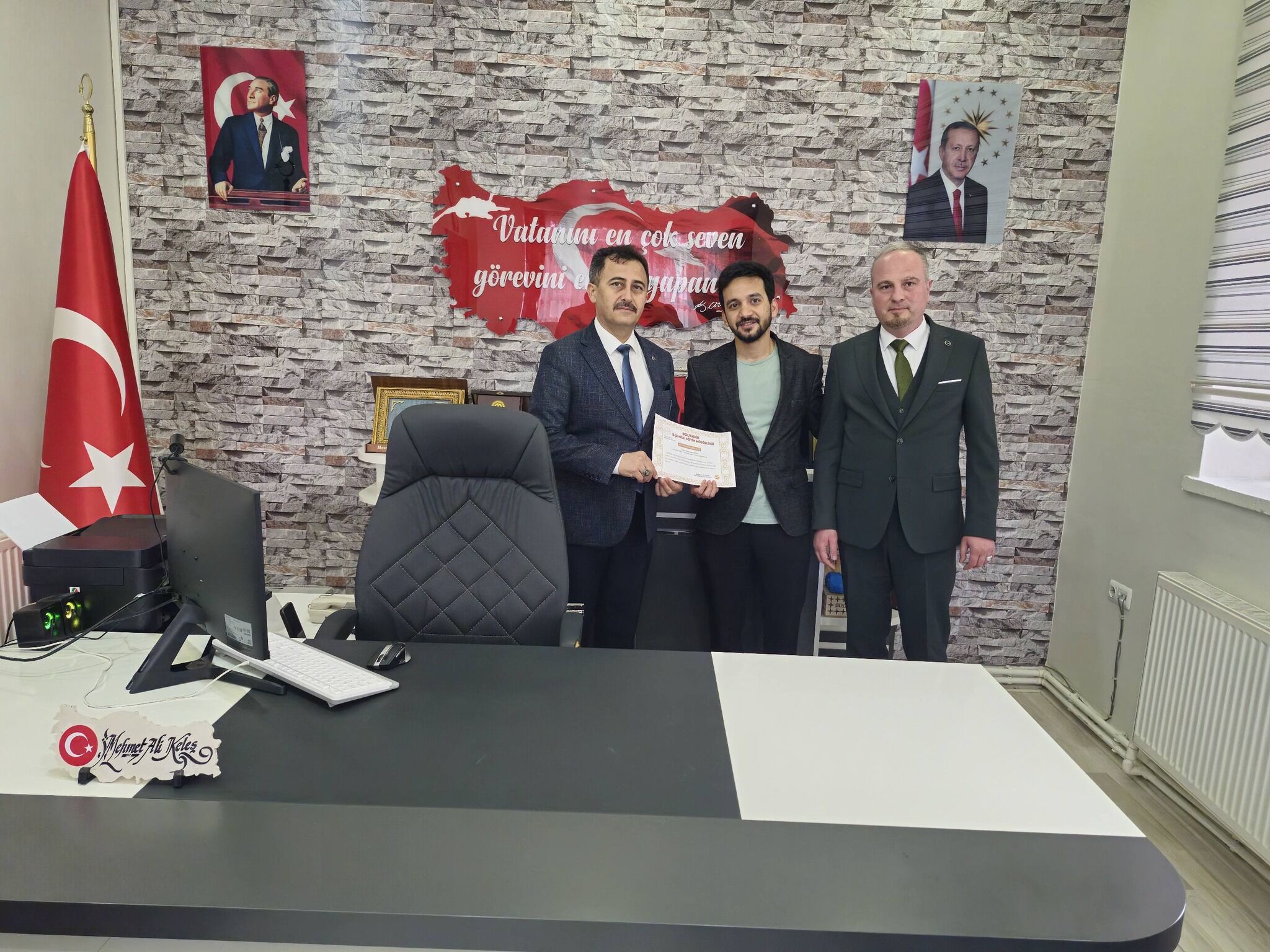 Bolvadin İlçe Milli Eğitim Müdürü Mehmet Ali Keleş, TÜBİTAK 2204 kapsamında yürütülen “Sokağın Sesi Kitabın Nefesi” projesiyle bölge birinciliği ve Türkiye finalistliği elde eden Süleyman Sakçı ile Kurum Müdürü Mesut Tunaboylu’yu makamında kabul etti.
