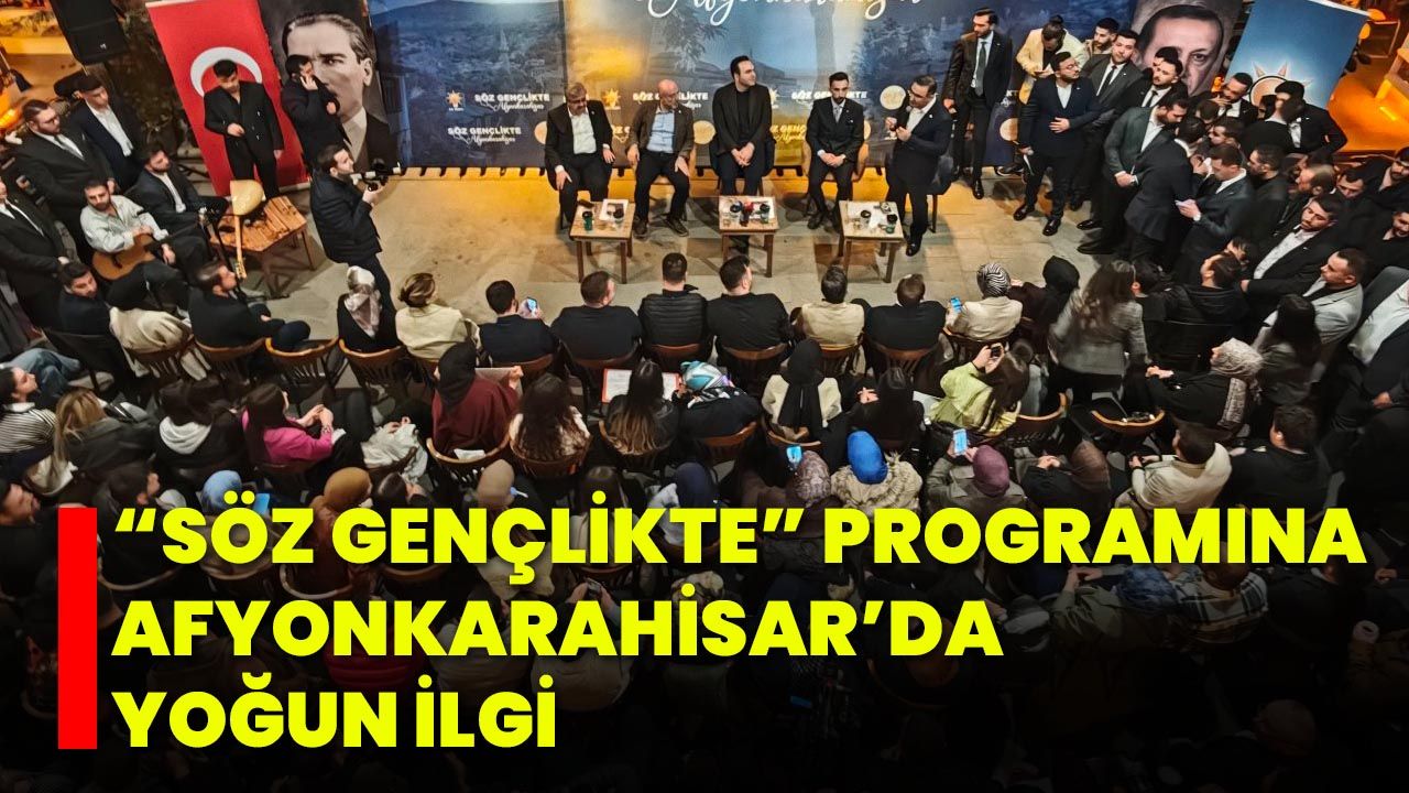 AK Parti Afyonkarahisar İl Gençlik Kolları tarafından düzenlenen “Söz Gençlikte” programı Afyonkarahisar’da gerçekleştirildi. Programa, AK Parti Gençlik Kolları Genel Başkanı Yusuf İbiş, AK Parti Afyonkarahisar İl Başkanı Av. Turgay Şahin, TBMM Başkanlık Divanı Üyesi ve Afyonkarahisar Milletvekili Av. İbrahim Yurdunuseven, Milletvekili Dr. Hasan Arslan, İl Gençlik Kolları Başkanı Mehmet Emin İntepe ve çok sayıda genç katıldı. Program, Taşhan’da düzenlendi.