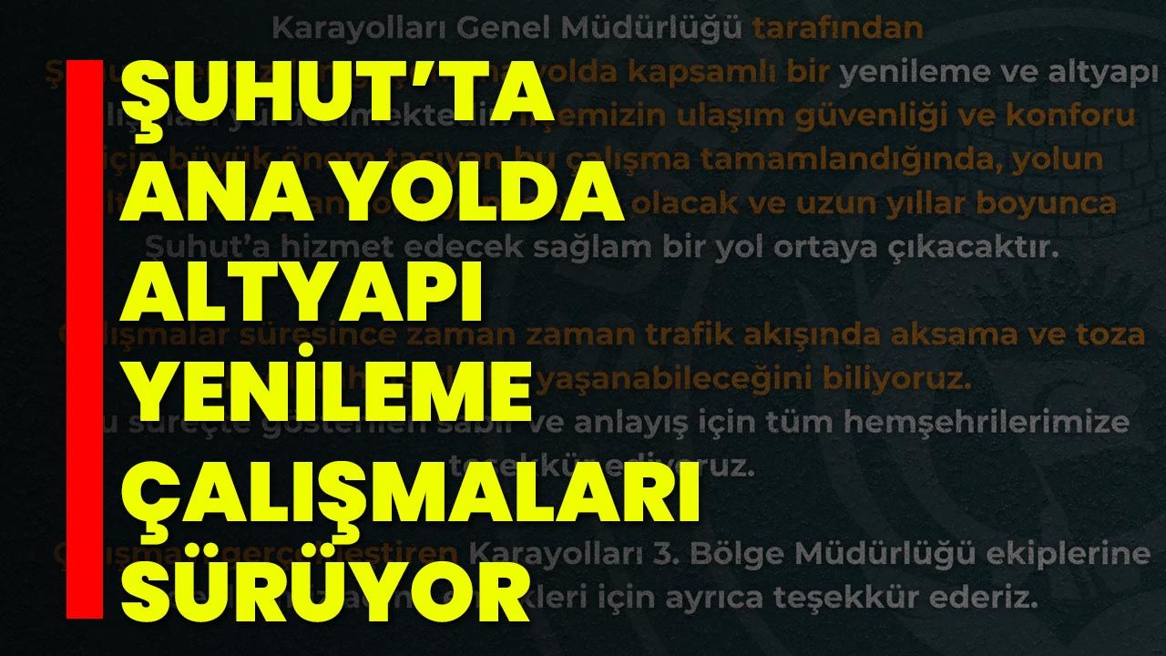 Şuhut merkezden geçen ana arterde Karayolları Genel Müdürlüğü tarafından kapsamlı yenileme ve altyapı çalışması gerçekleştirildiği bildirildi. İlçenin ulaşım güvenliği ve konforu açısından büyük önem taşıyan çalışmanın tamamlanmasıyla, yol altyapısının baştan sona yenilenmiş olacağı ve uzun yıllar boyunca Şuhut’a hizmet edecek sağlam bir ulaşım hattının ortaya çıkacağı ifade edildi.