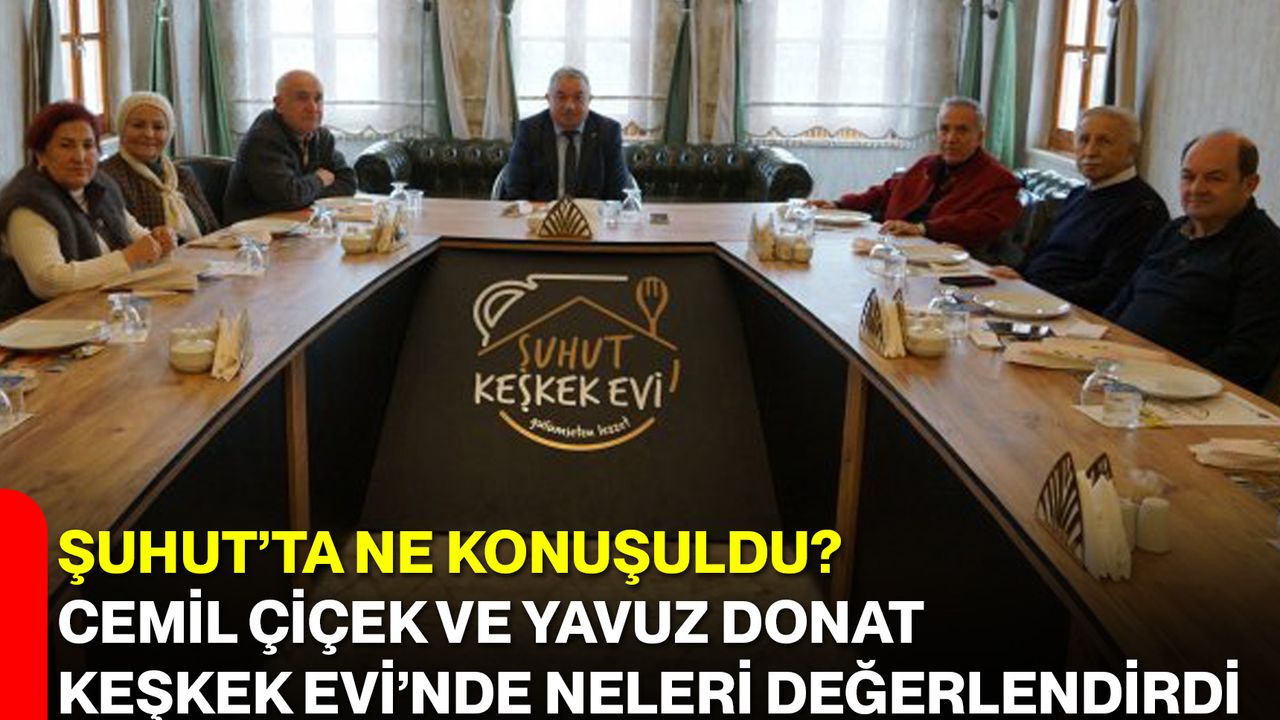 Şuhut Belediye Başkanı Muhittin Özaşkın, Cumhurbaşkanlığı Yüksek İstişare Kurulu Üyesi ve 25. Türkiye Büyük Millet Meclisi Başkanı Cemil Çiçek ile Sabah Gazetesi köşe yazarı Yavuz Donat’ı, Gazetemiz Kurucusu ve Başyazarı Mehmet Emin Güzbey ve iş insanı Muzaffer Aksu’nun da katılımıyla Şuhut Keşkek Evi’nde misafir etti. İlçenin simge mekânlarından biri olan Keşkek Evi’nde gerçekleşen ziyaret, samimi bir atmosferde gerçekleştirildi.
