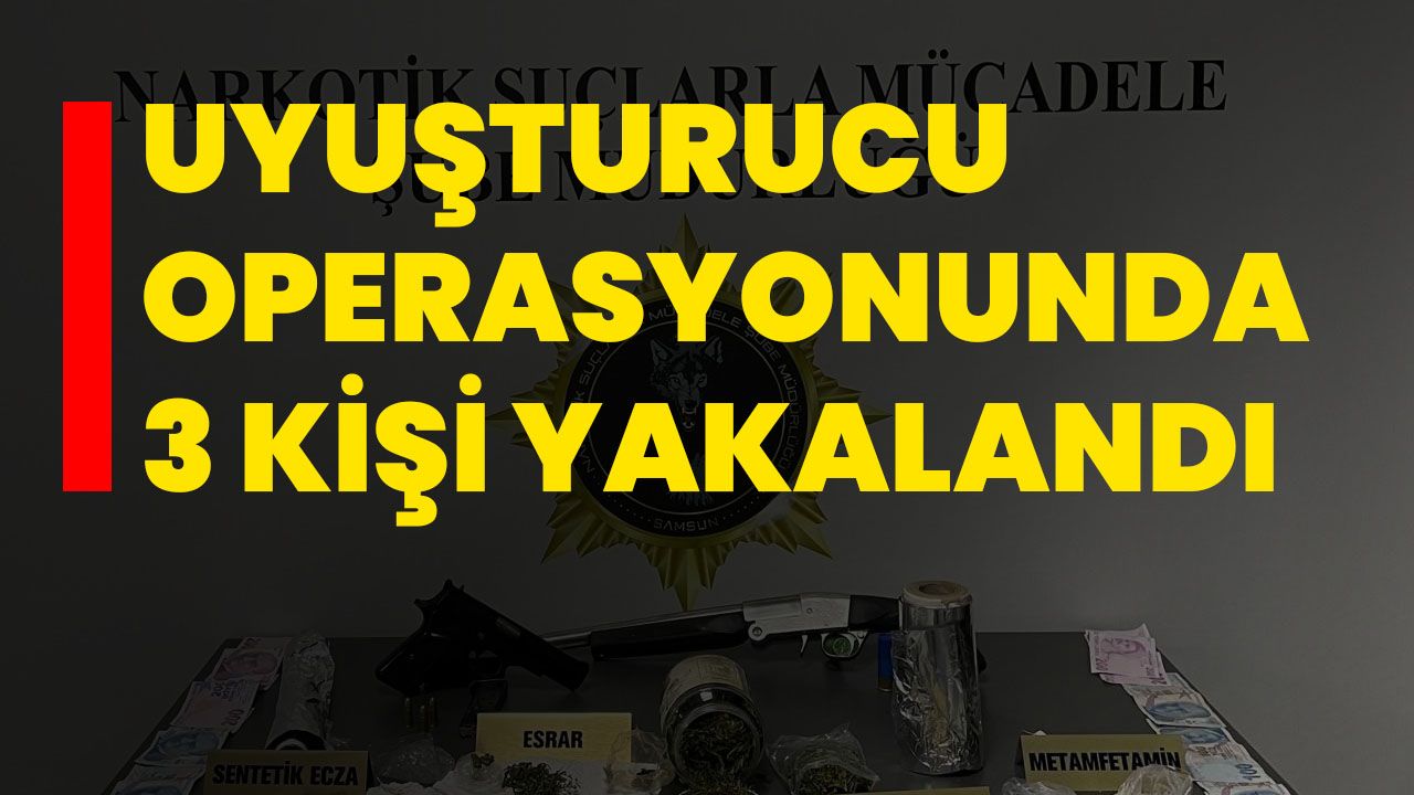 Samsun İl Emniyet Müdürlüğü Narkotik Suçlarla Mücadele Şube Müdürlüğü ekiplerince, uyuşturucu ticaretinin önlenmesine yönelik yürütülen çalışmalar kapsamında Çarşamba ilçesinde gerçekleştirilen eş zamanlı operasyonda M.Y. (38), E.Y. (33) ve 18 yaşından küçük bir çoğunun bir ikamet ve iş yerlerinde arama yapıldı. Aramalarda 19,02 gram metamfetamin, 68,89 gram esrar, 16 adet sentetik ecza, 1,05 gram sentetik kannabinoid, 1 adet hassas terazi, uyuşturucu madde ticaretinden elde edildiği değerlendirilen bin 500 TL nakit para, 1 adet ruhsatsız tabanca, 1 adet ruhsatsız tüfek ve 3 adet tabanca fişeği ele geçirildi.