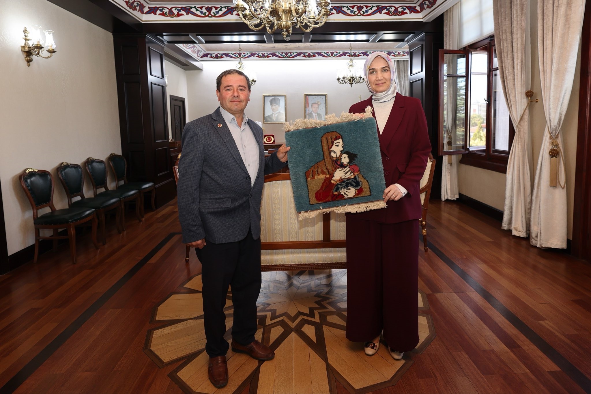 Muhtar Özgenç , annesi tarafından dokunan çocuk ve anne figürlü halıyı Vali Yiğitbaşı'na takdim etti ve nazik kabulleri dolayısıyla Yiğitbaşı’na teşekkür etti.