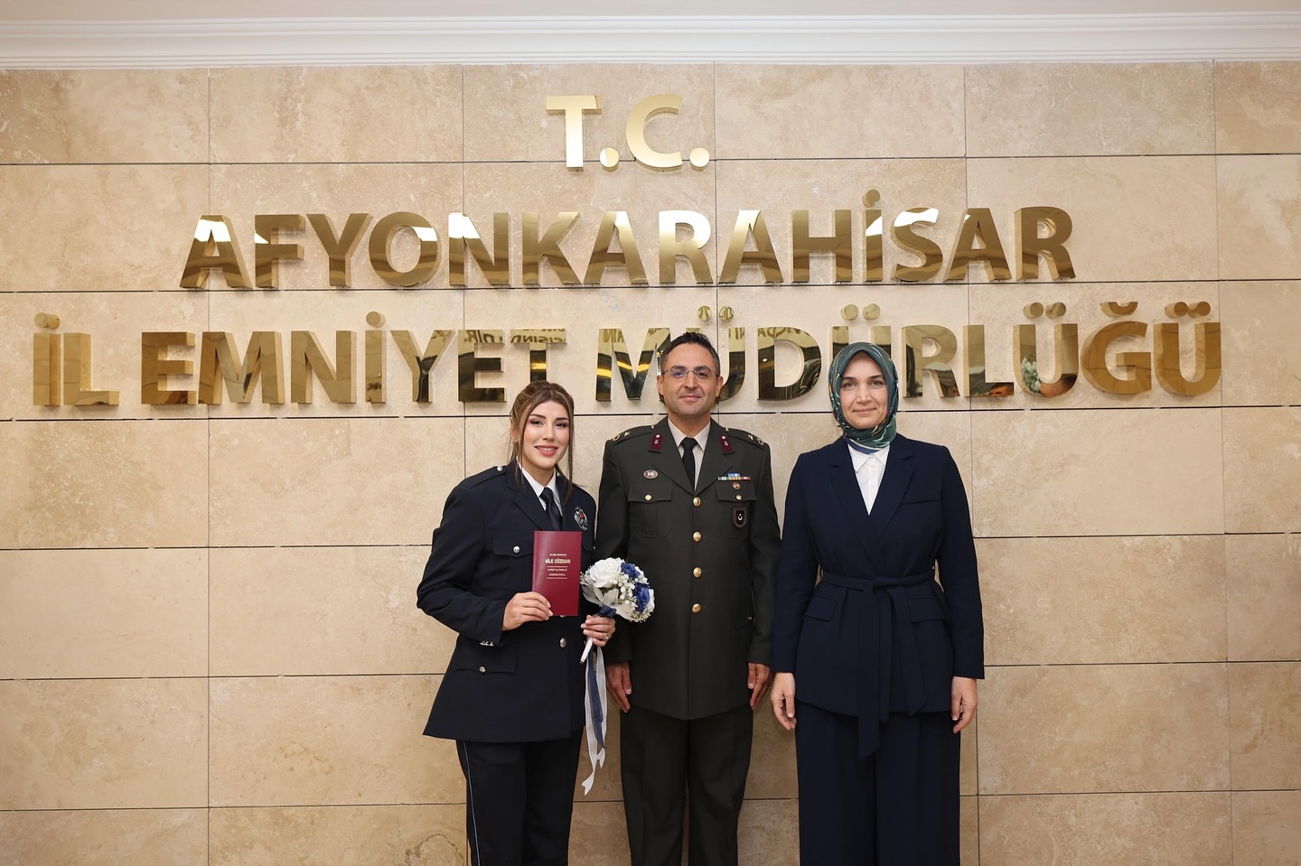 Afyonkarahisar İl Emniyet Müdürlüğünün ev sahipliğinde düzenlenen anlamlı törende, hayatlarını birleştiren genç çiftin mutluluğuna birçok önemli isim tanıklık etti.