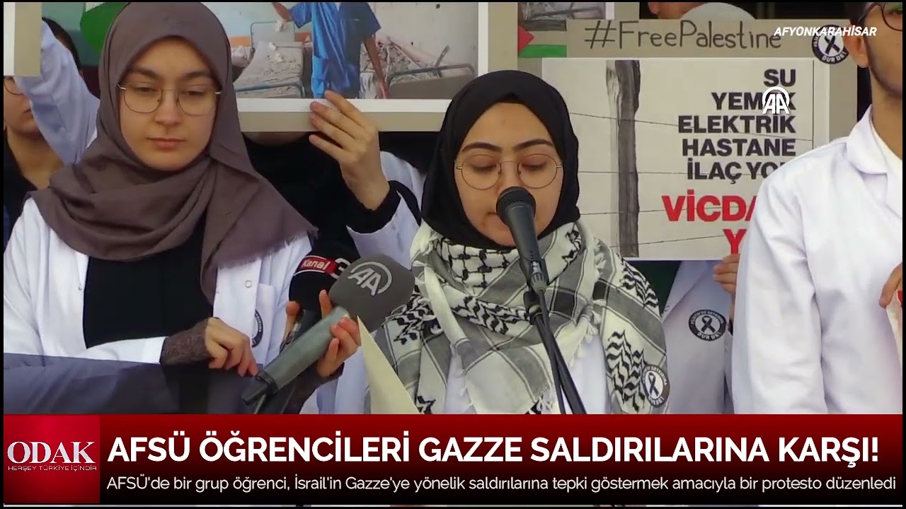 Afyonkarahisar Sağlık Bilimleri Üniversitesi'nden (AFSÜ) bir grup öğrenci, İsrail'in Gazze'ye yönelik saldırılarına tepki göstermek amacıyla bir protesto düzenledi. Afyonkarahisar'da bulunan Zafer Sağlık Külliyesi'ndeki D-Blok önünde toplanan öğrenciler, pankartlar ve Türk ve Filistin bayraklarıyla...
