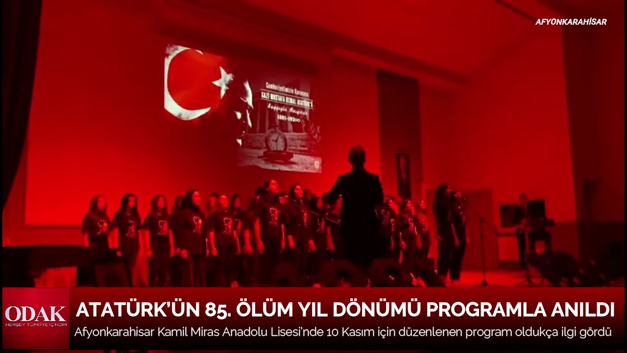 Afyonkarahisar Kamil Miras Anadolu Lisesi’nde 10 Kasım Ulu Önder Mustafa Kemal’in 85. ölüm yıl dönümü anıldı. Öğrencilerin okudukları şiirlerle ve yaptıkları koroyla anısına yakışır gösteri düzenlendi.
